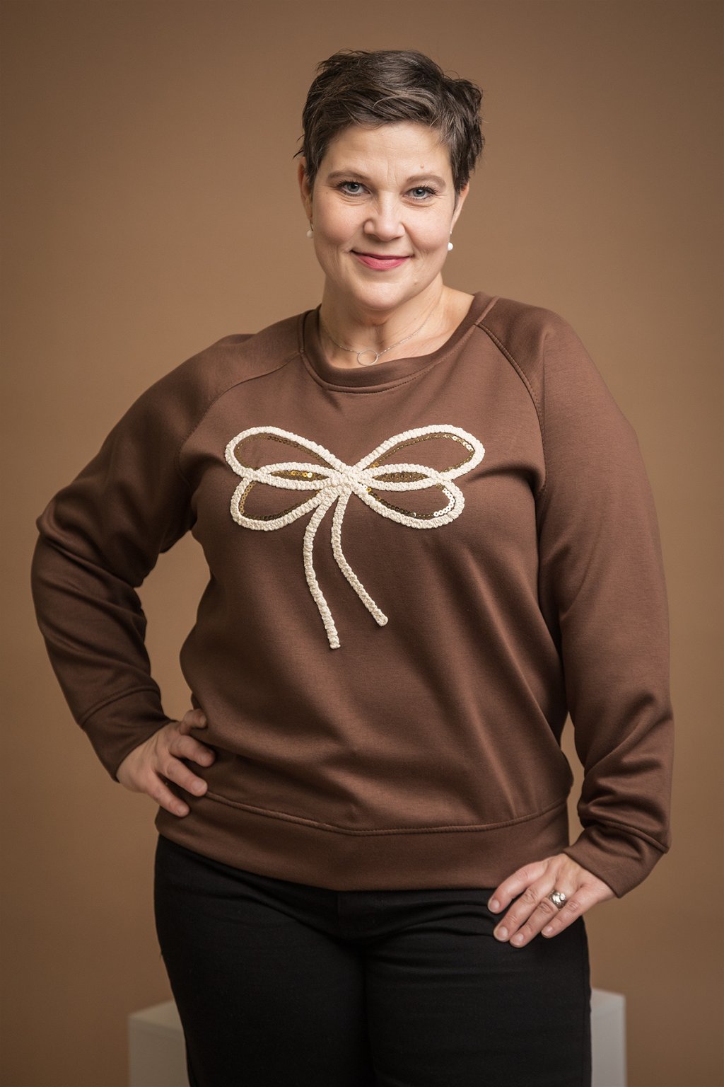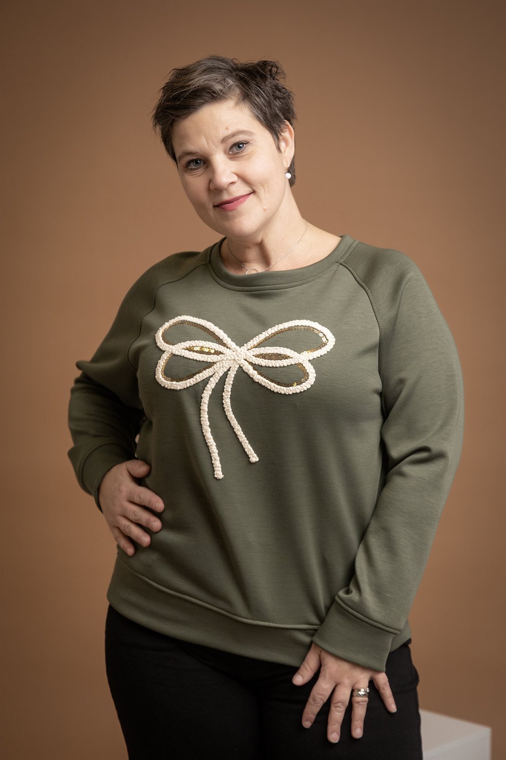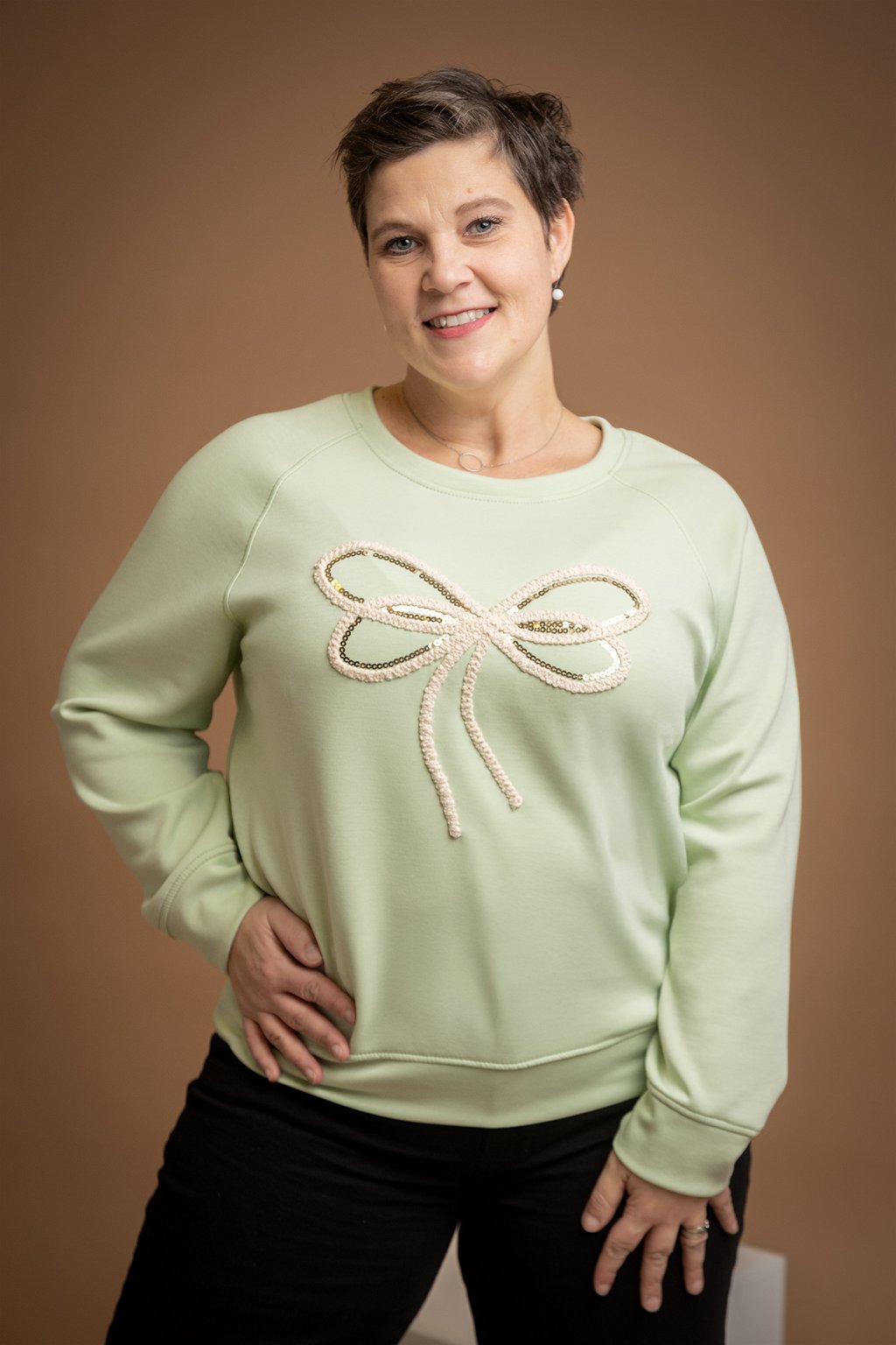 Dámská elegantní mikina JAMIE, která je na přední straně zdobená motivem mašle - aplikace je vyšitá a doplněná i lesklými flitry. Tento kousek je navíc z velice příjemného máslové materiálu.