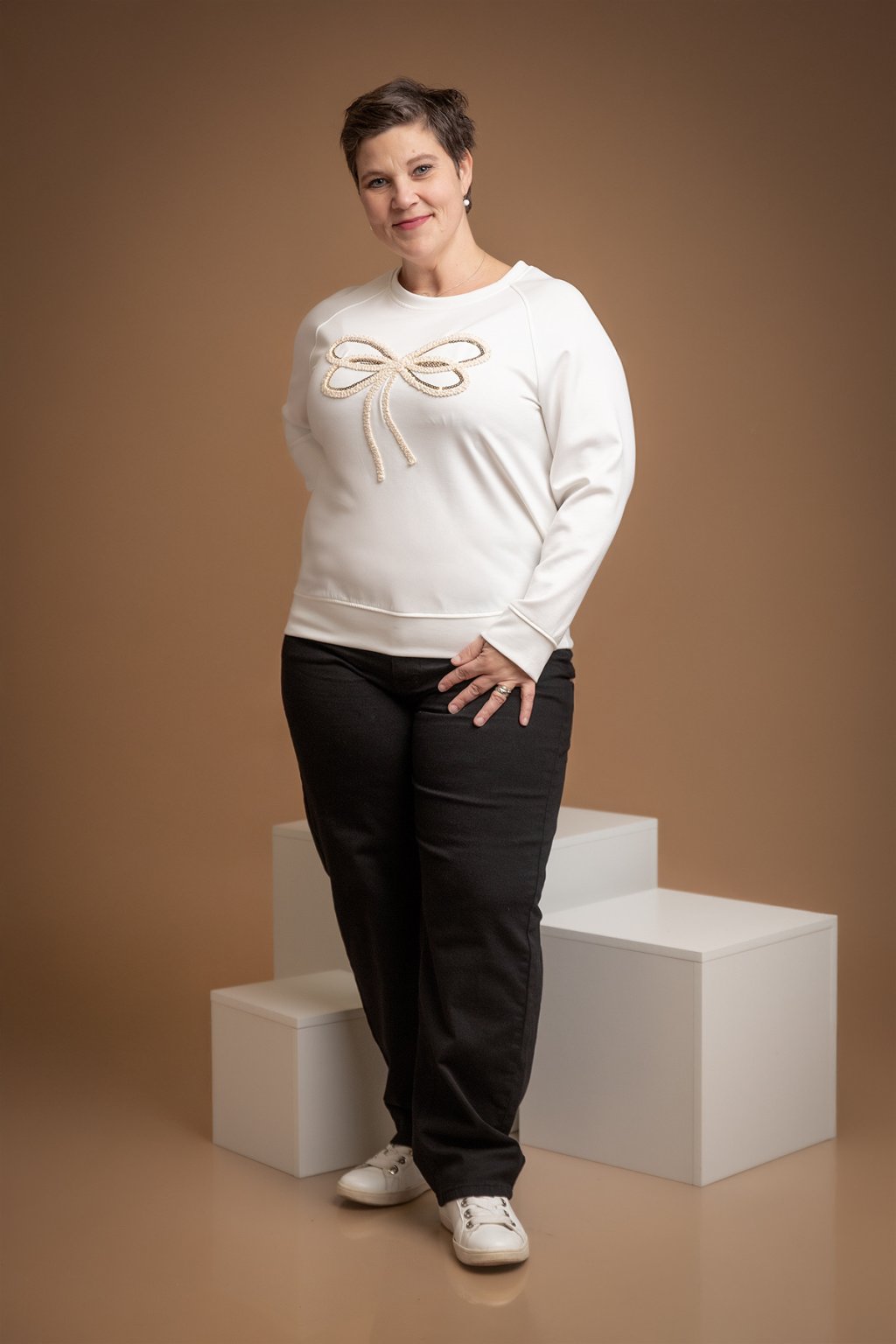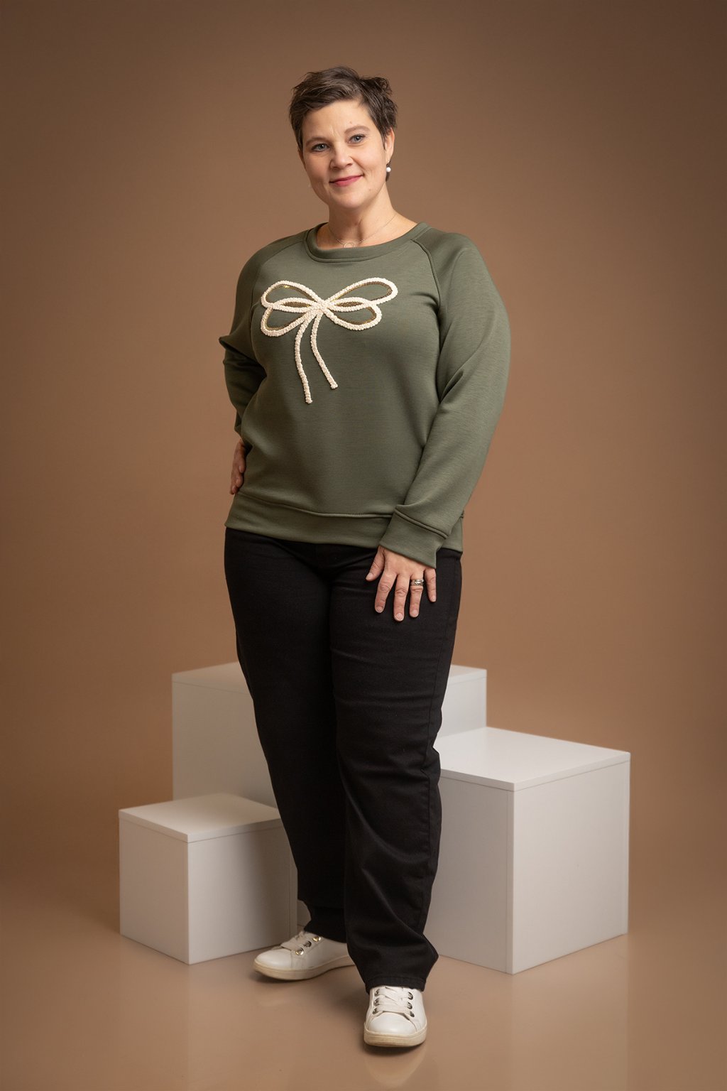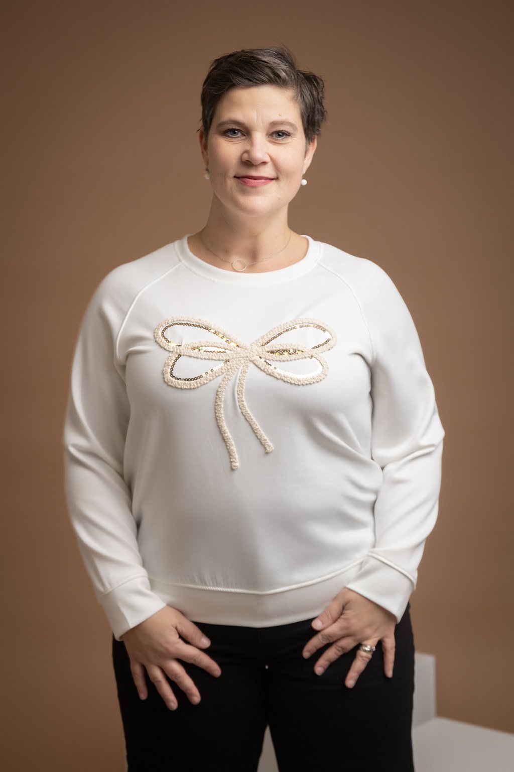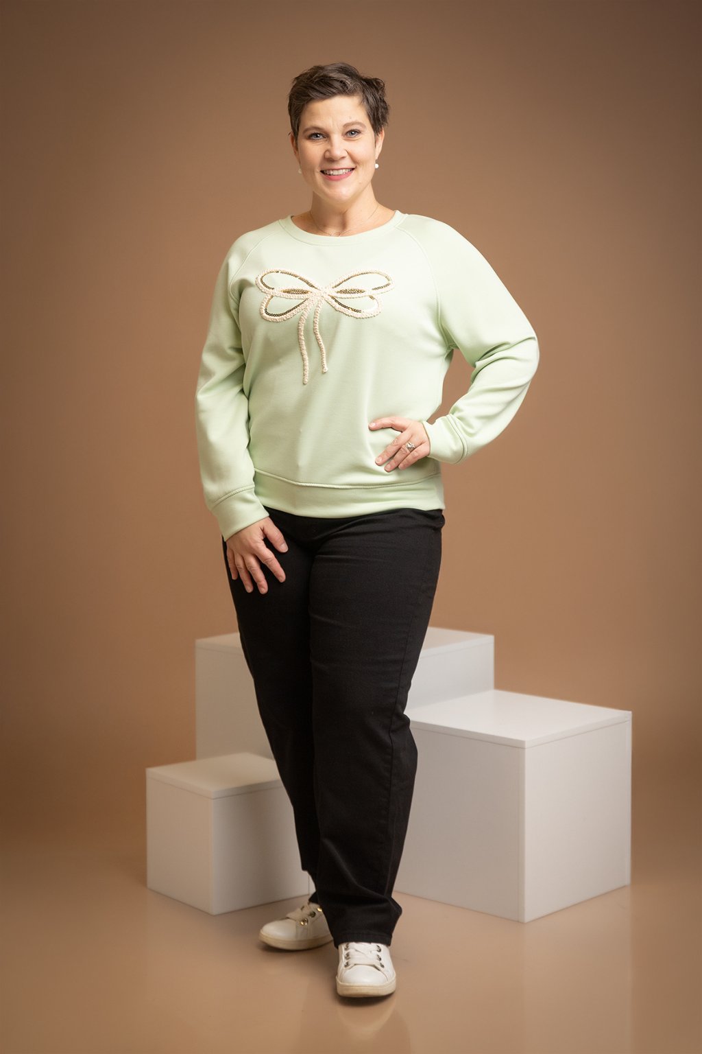 Dámská elegantní mikina JAMIE, která je na přední straně zdobená motivem mašle - aplikace je vyšitá a doplněná i lesklými flitry. Tento kousek je navíc z velice příjemného máslové materiálu.
