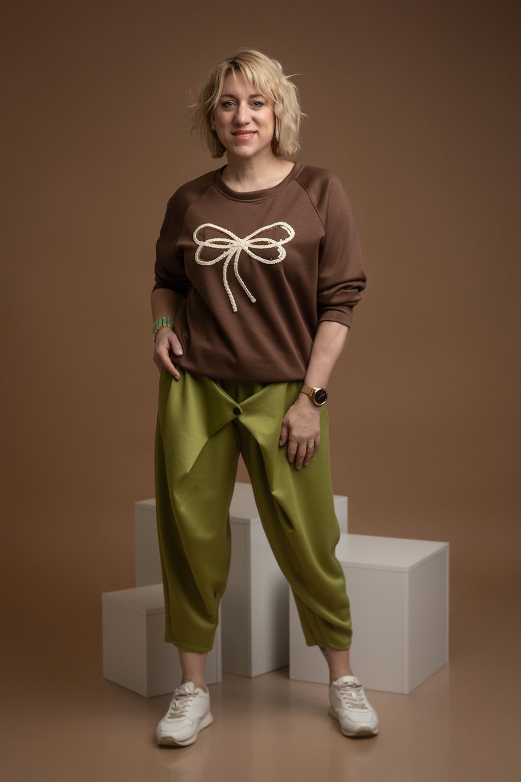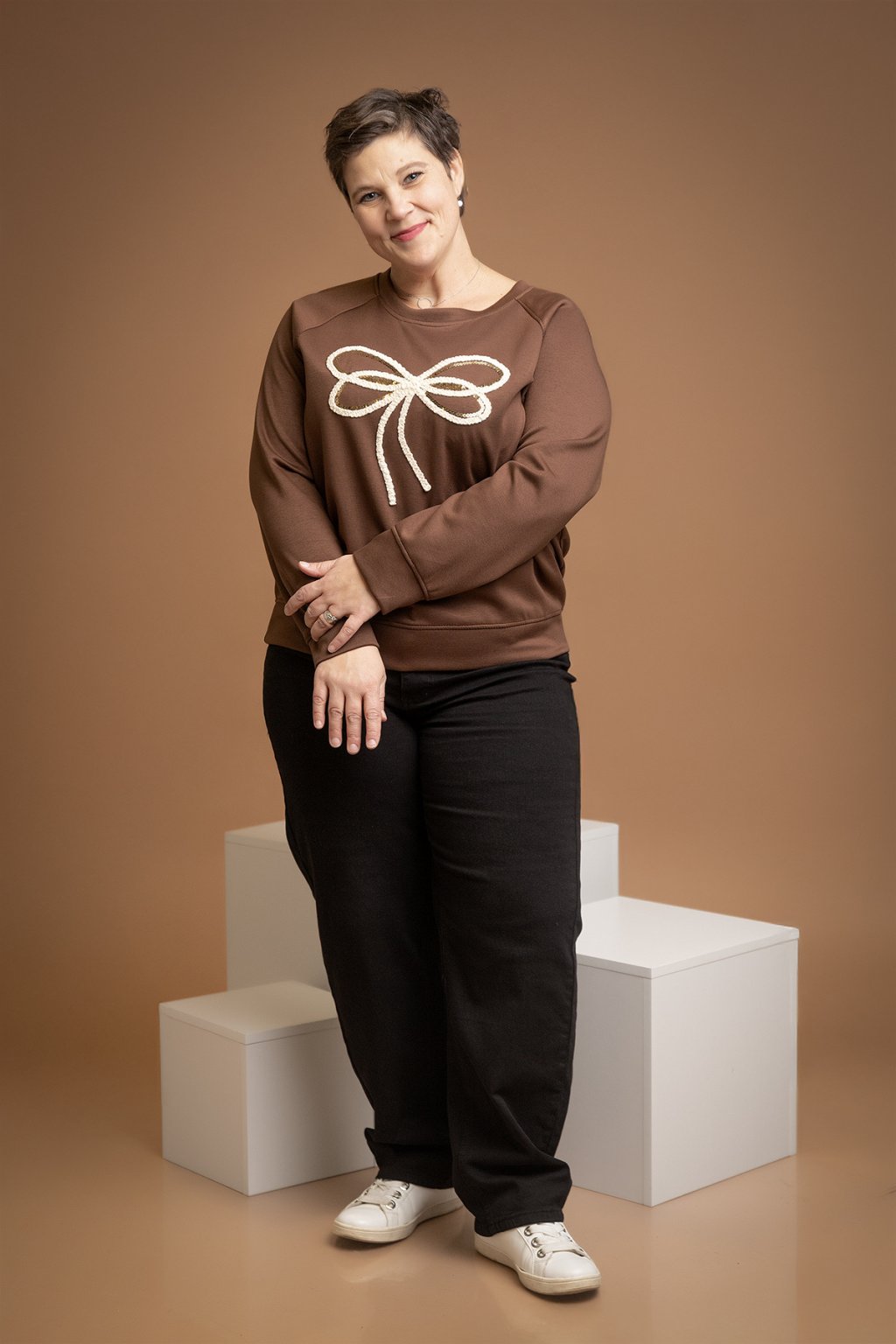 Naší dámskou elegantní mikinu JAMIE zkrátka musíš mít. Tento jedinečný kousek s nadčasovým volným střihem tě zaujme hned na první pohled. Je z příjemného máslového materiálu, který tě pohladí po těle a dodá potřebné pohodlí. Tato elegantní mikina má dlouhé rukávy a výstřih střižený do kulata. Svým volným střihem se zalíbí i milovnicím oversize střihů a skryje veškeré nedokonalosti. Roztomilý vyšitý motiv mašle zdobí přední stranu a navíc je doplněn i lesklými flitry. Šmrnc a styl ti tento kousek ukáže hned v několika barvách a bude ti perfektně sedět pokud nosíš velikost L-2XL.