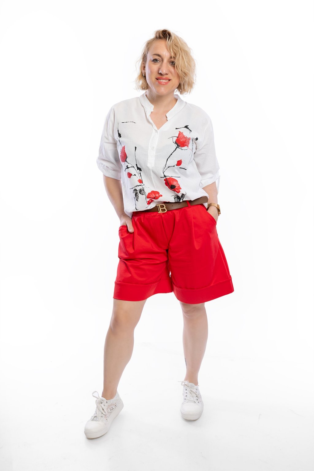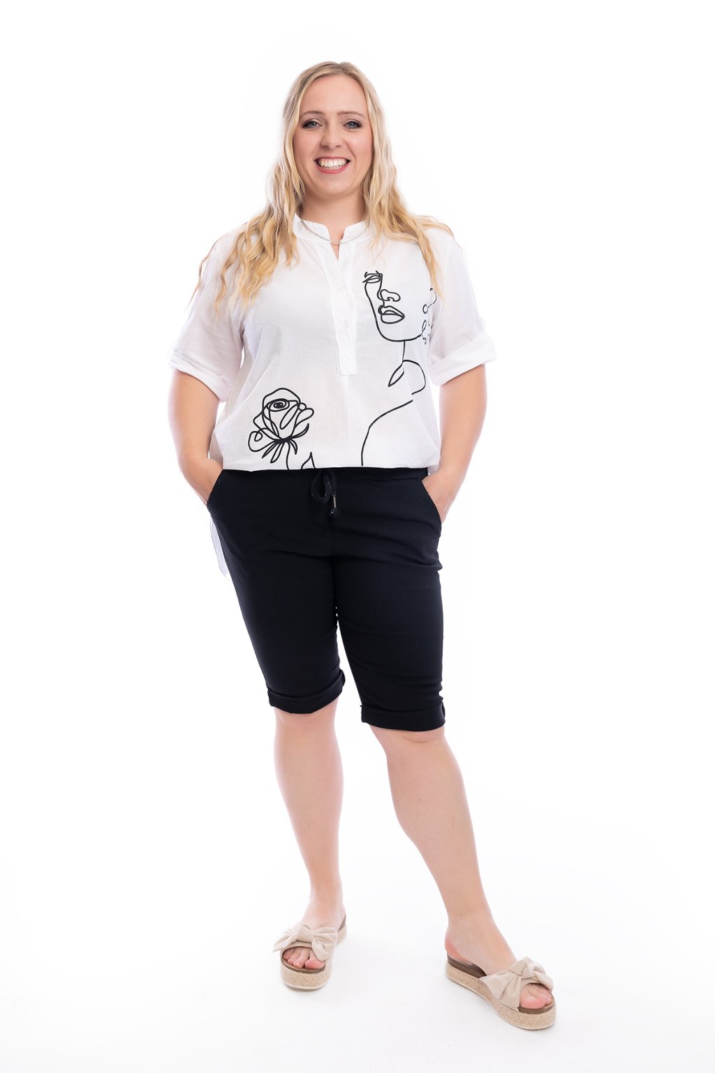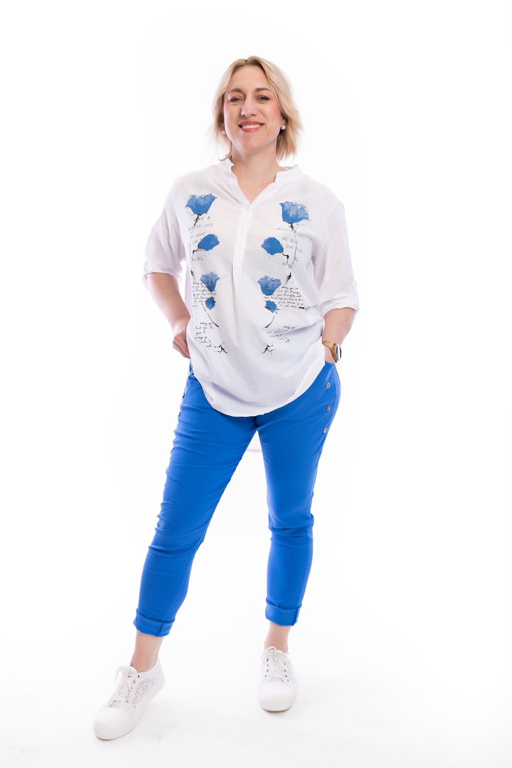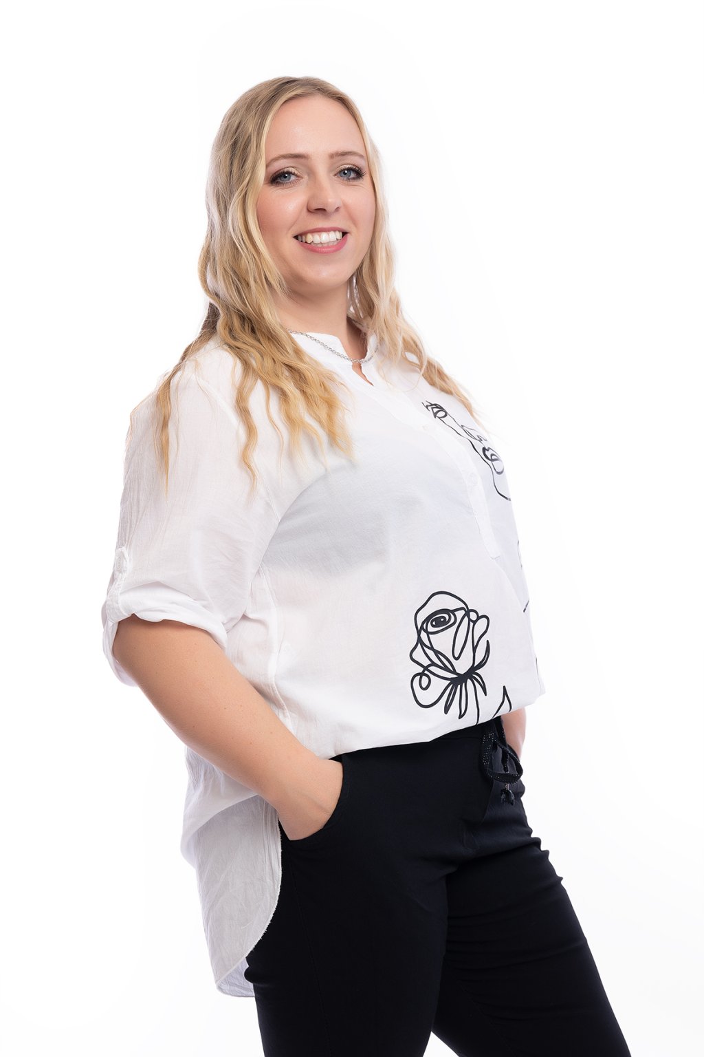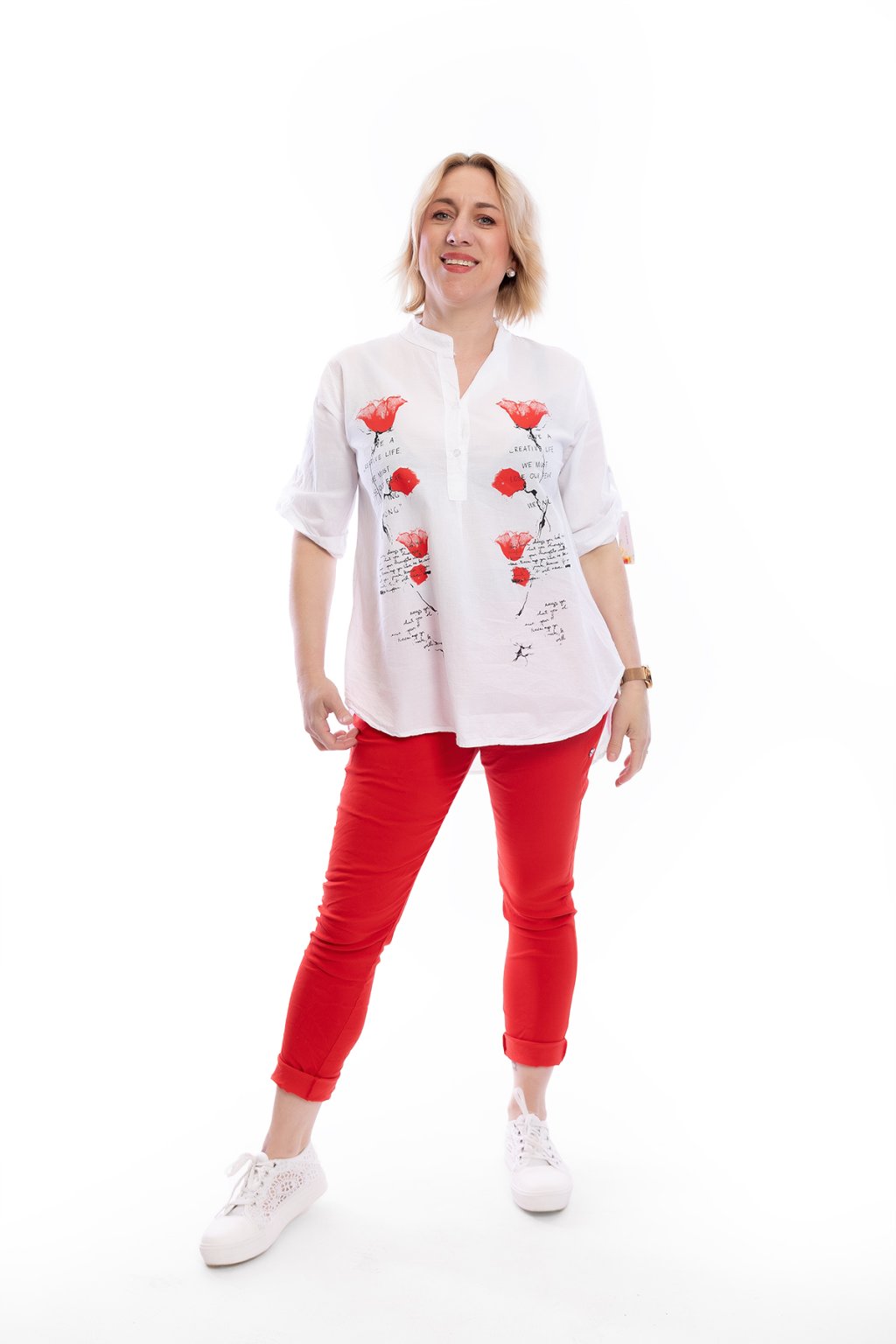Dámská bílá košile CREATIVE s neokoukaným vzorem zaujme na první pohled. Má zajímavě řešený výstřih do véčka se zapínáním na knoflíčky. Rukáv je také na připínání. Spodní lem je střižený hezky dokulata. Doporučujeme si pod košili vzít tělové nebo světlé spodní prádlo. Nosit ji můžeš také jako oversize, ale nejlépe sedne na M až XL. Vybírat můžeš z několika vzorů.