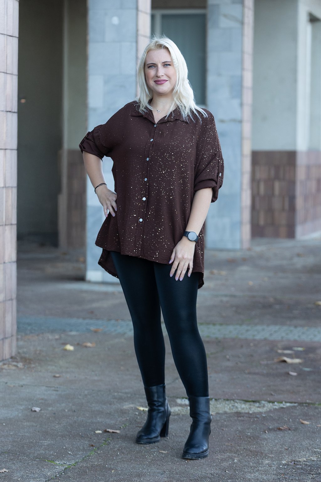 Dámská elegantní košile AMOR je unikátní a velice šik kousek, který je po celé délce zdobený zlatými cákanci. Ty dodávají košili šmrnc a ideální kousek i na výjimečné události.