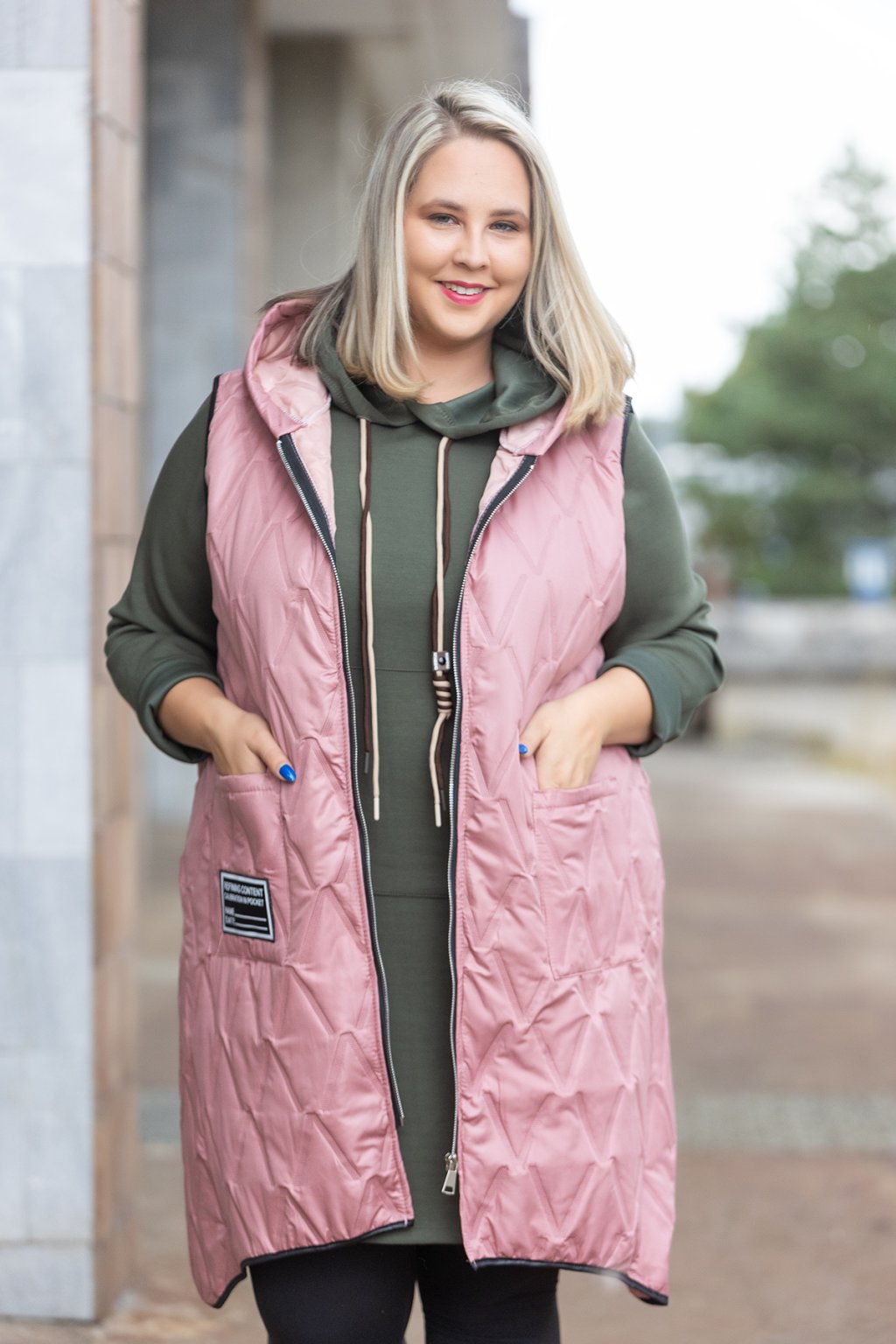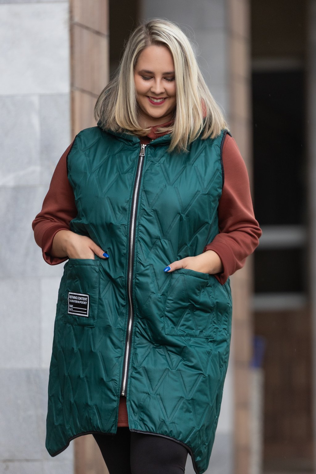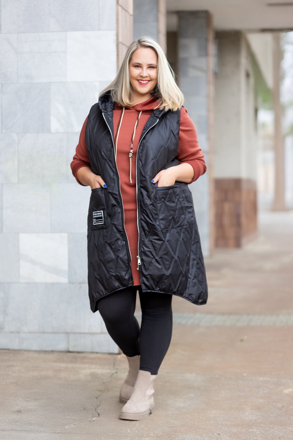 Dámská vesta TOFFI je skvělý kousek, který budeš chtít nosit každý den. Vestička je krásně příjemná na dotek a zdobená prošíváním po celé své délce. Vesta je delšího střihu, dolní lem je střižen do kulata a samozřejmostí je i kapuce, takže Tě žádný nešvar počasí nepřekvapí. Vepředu najdeš super praktické kapsičky, zdobené našitým ozdobným štítkem. Tento kousek sedne na velikost 2XL-4XL a můžeš vybírat ze spousty krásných barev tu pravou, která prozáří Tvůj den.