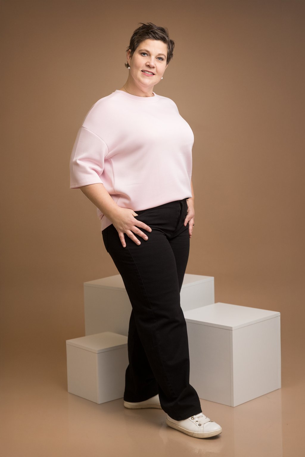 Tento model pro tebe nafotila naše Adél, na sobě má velikost 2XL a její míry najdeš zde.