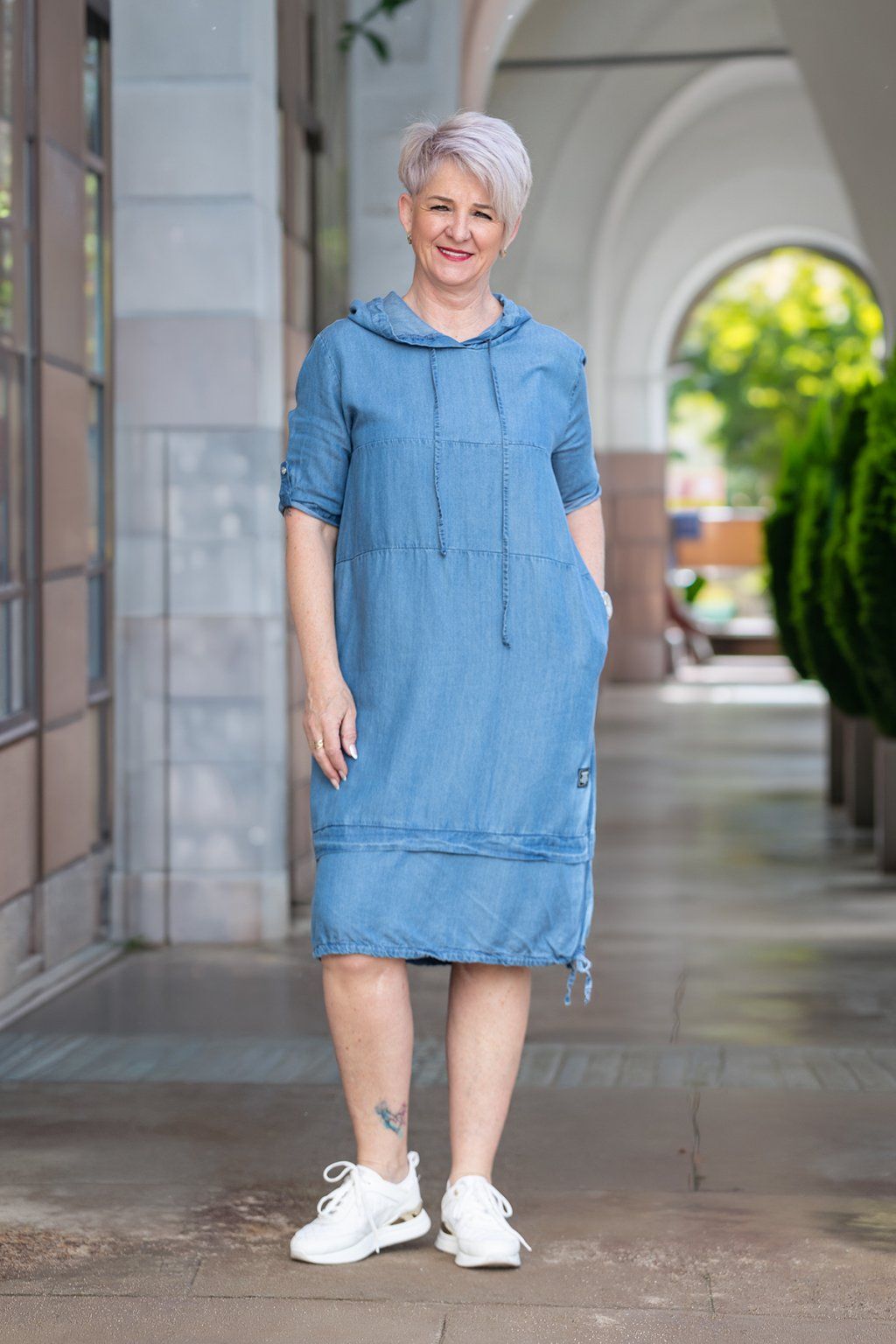 Dámské šaty OLA jsou jedinečný a nevídaný kousek. Mají volný splývavý střih a jsou neuvěřitelně pohodlné. U krku je navíc zdobí i stylová kapuce, která je doplněná tkaničkami a dodá kousku šmrnc. Šaty mají dlouhé rukávy, které se dají sepnout. Jsou zdobené i vodorovnými švy a po bocích jim nechybí ani praktické kapsy. Ve spodní části je zdobí nášivka. Spodní lem se dá krásně přizpůsobit díky zavazování. V naší nabídce jsou v neodolatelné denimově modré barvě - světlé i tmavé a nejlépe ti budou sedět pokud nosíš velikost L - 2XL.