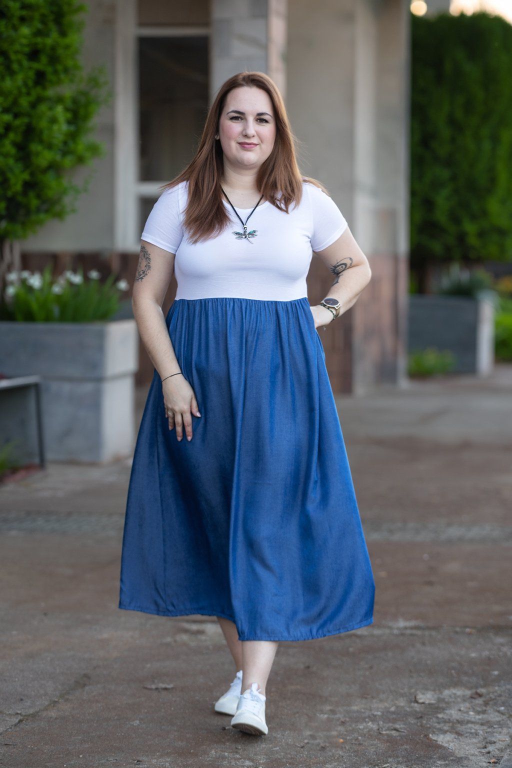 Dlouhé šaty BRINA tě uchvátí svým střihem a neuvěřitelně pružným a příjemným materiálem. Vrchní část je jako tričko s krátkým rukávem a krásně pruží, tím se skvěle přizpůsobí tvé postavě. Následuje splývavá sukně v denimové barvě a navíc hází lesklé a třpytivé odlesky. Po stranách má sukně i praktické kapsy, které určitě každá z vás ocení. Tato kombinace je jednoduchá a velice stylová. V naší nabídce najdeš více barviček a nejlépe ti sednou pokud nosíš velikost L-2XL.