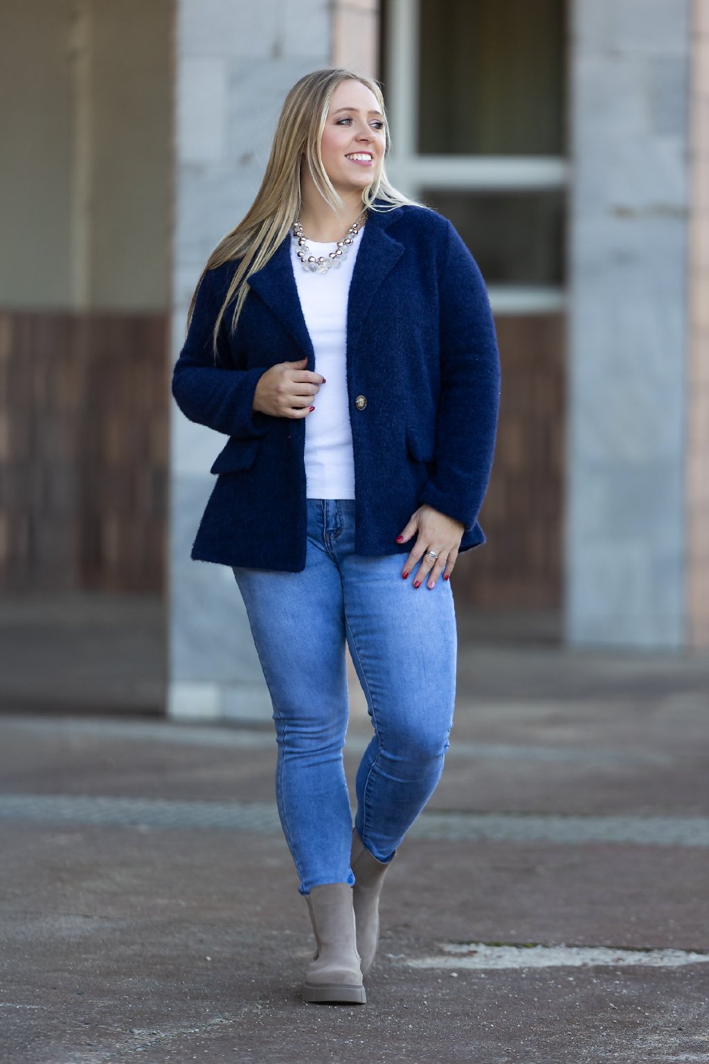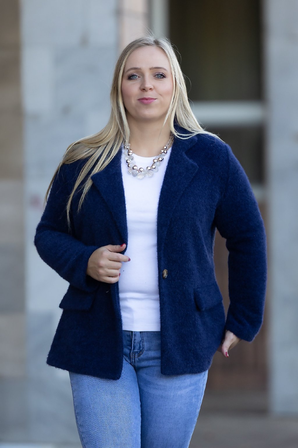 Dámské elegantní sako LISY je z velice příjemného materiálu. Nadčasový kousek se zapínáním na knoflík a falešnými kapsami na přední straně. U krku ho zdobí krásný límec s klopy.