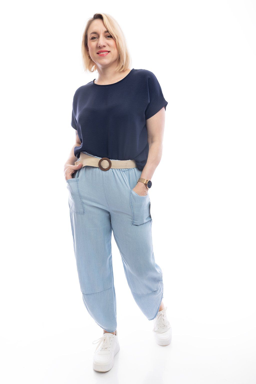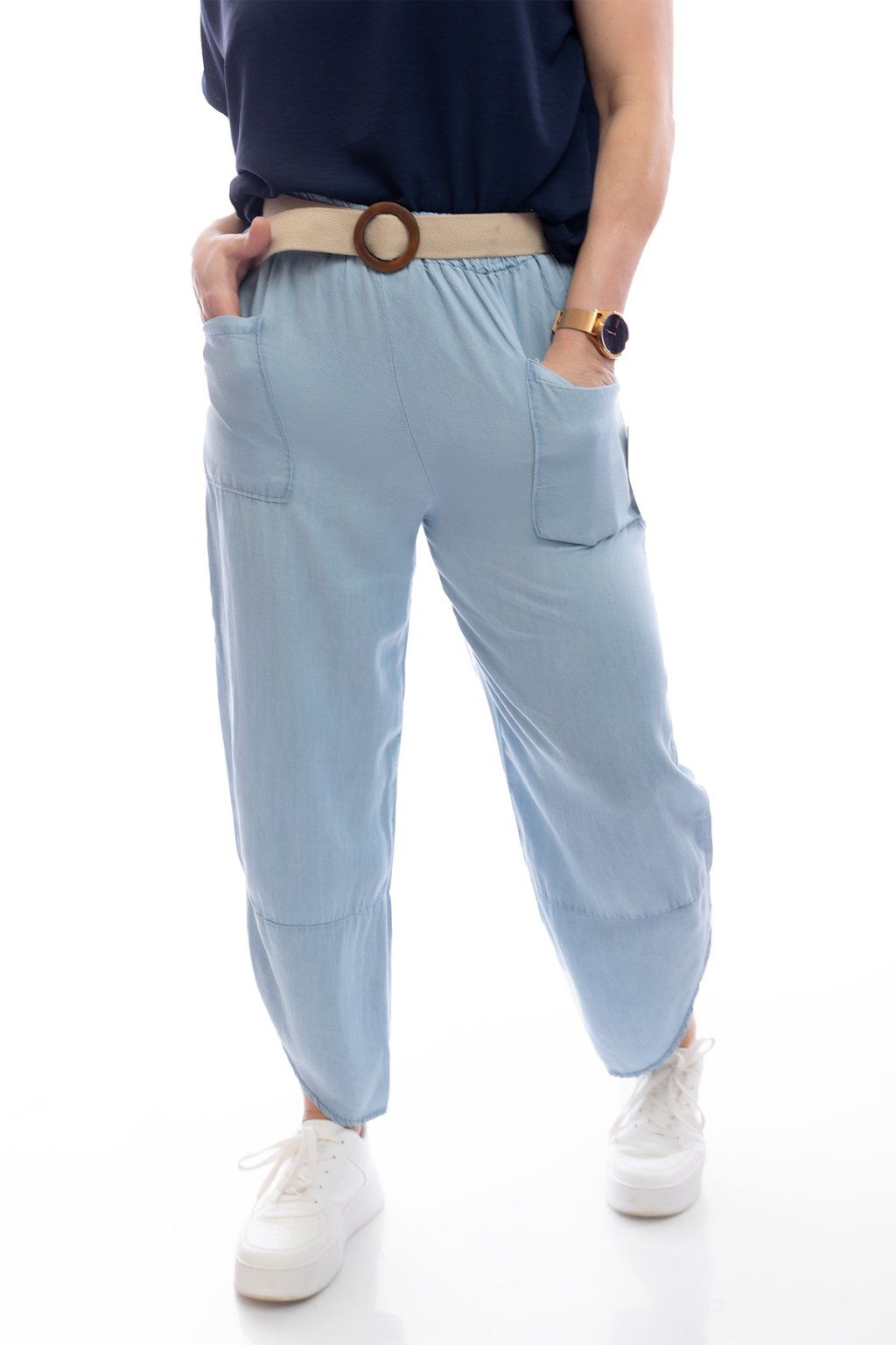 Hledáš kalhoty, které vypadají jako džíny, ale přitom jsou úžasně vzdušné a pohodlné? Mrkni na tyhle dámské kalhoty MAXEN. Mají volný střih a na bocích dvě kapsy. Jsou doplněny páskem, který doladí jejich nenucený vzhled. Nejlépe sednou velikostem S až L.