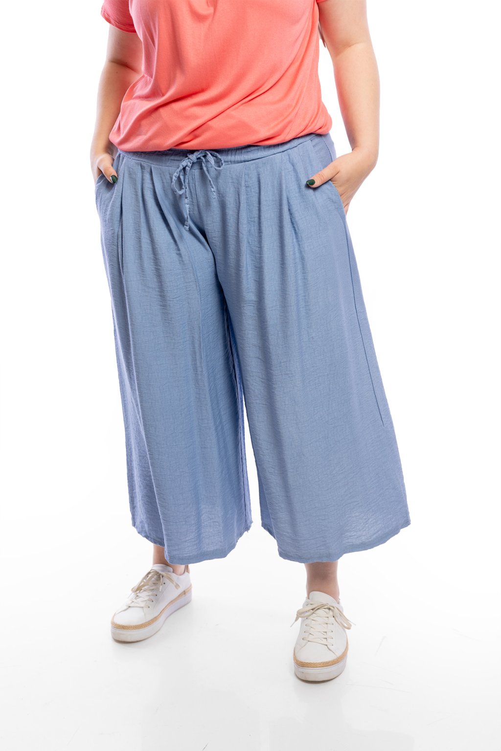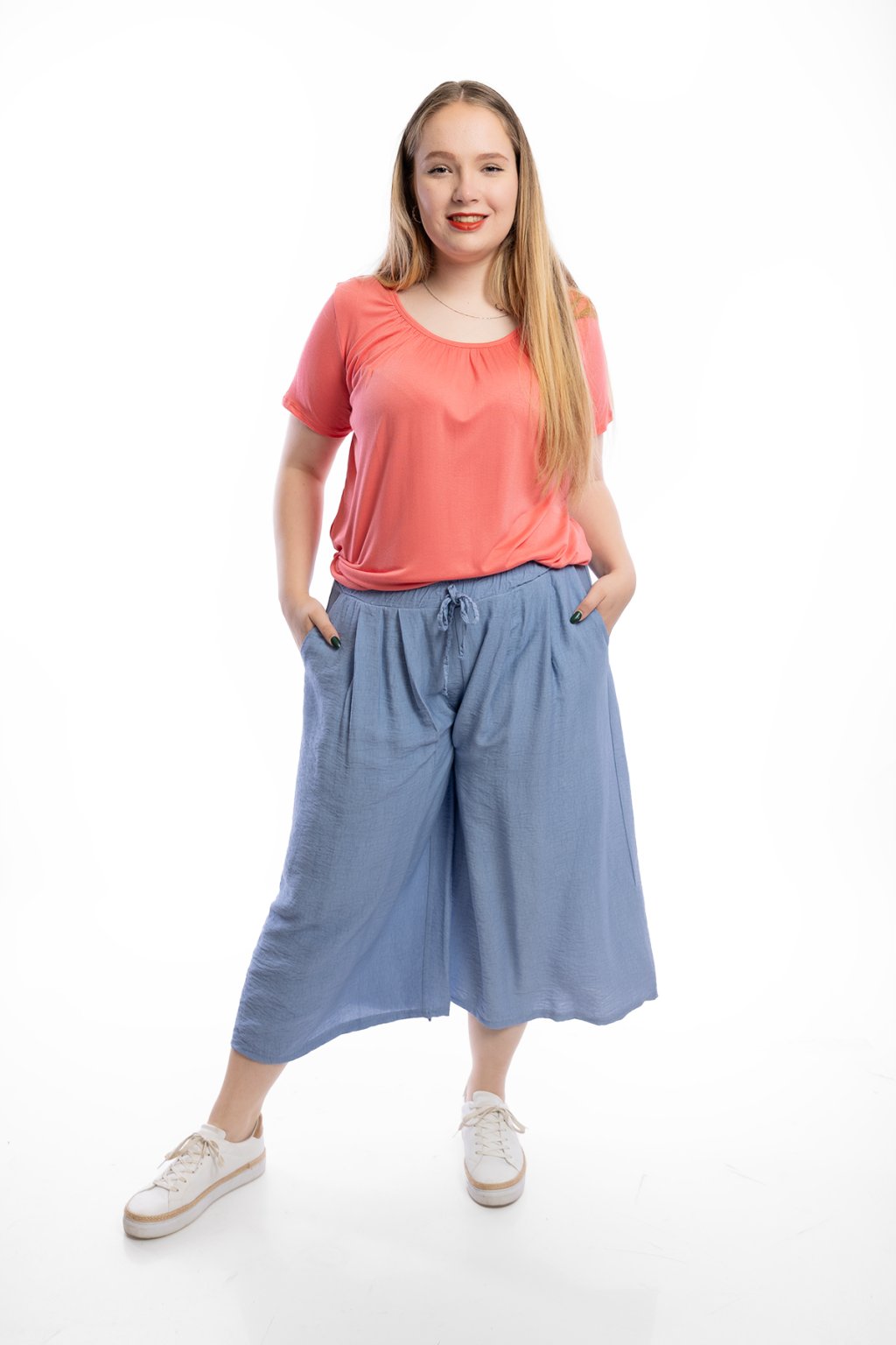 Dámské letní kalhoty JOANA jsou pohodlného a stylového střihu culottes. Tento široký typ střihu hezky sedne všem typům postav. Díky složení kalhot ze 100% viskózy jsou vzdušné a prodyšné - ideální do teplého letního počasí. V pase je pružná guma, ozdobné vázání a jemné řasení. V oblasti boků se nachází kapsy. Velikostně nejlépe sednou na M až 2XL. Vybírat můžeš z několika barev.