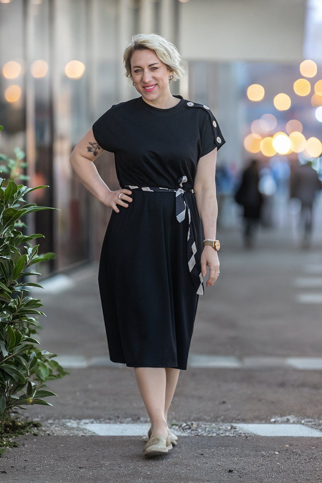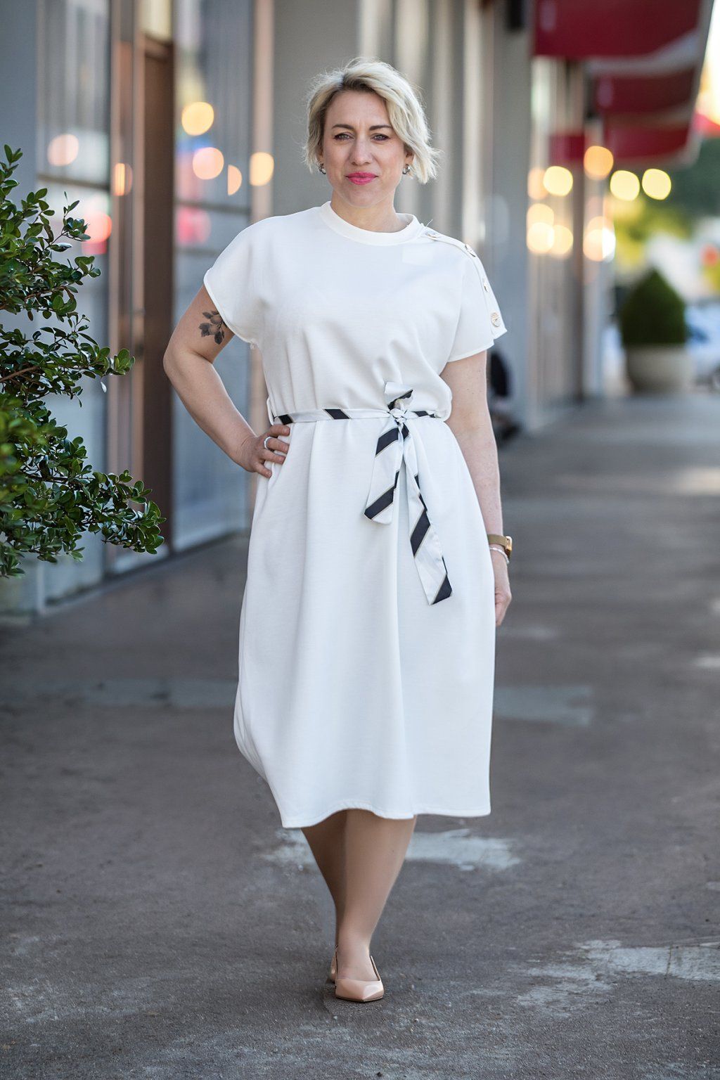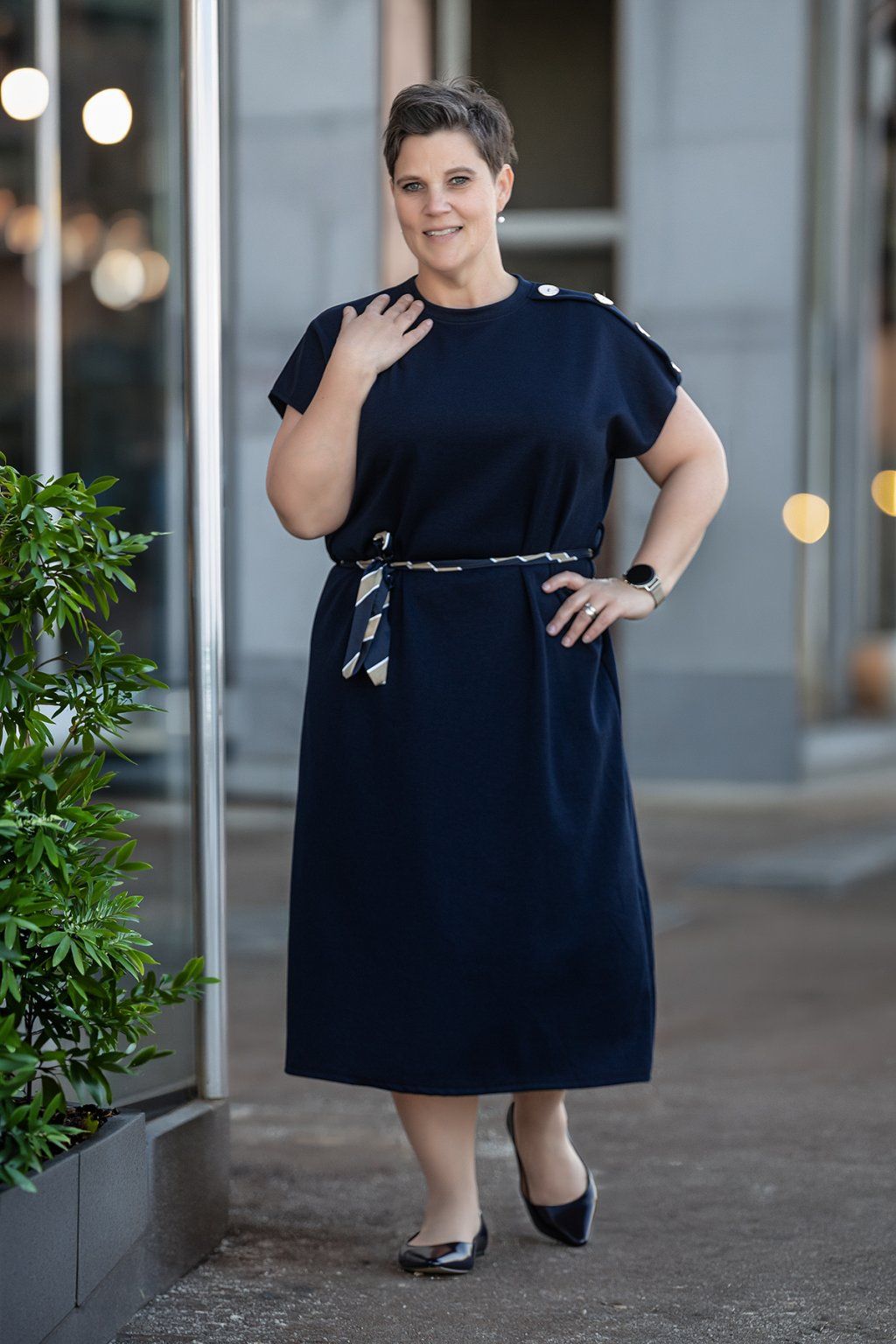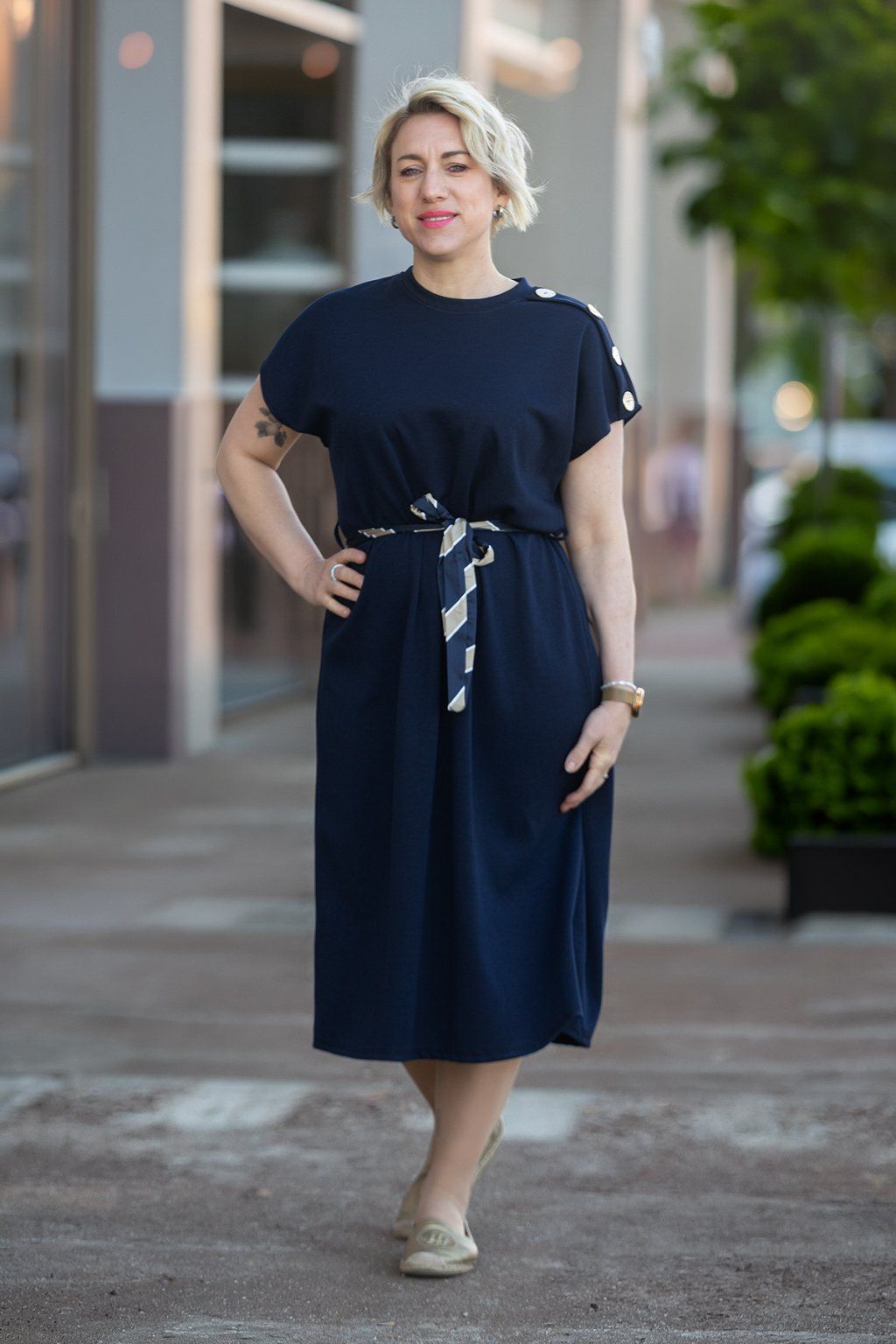 Dámské midi šaty DELFY křičí elegancí a stylem! Mají volný střih, jsou doladěné páskem a na ramenou je zdobí lesklé knoflíky.