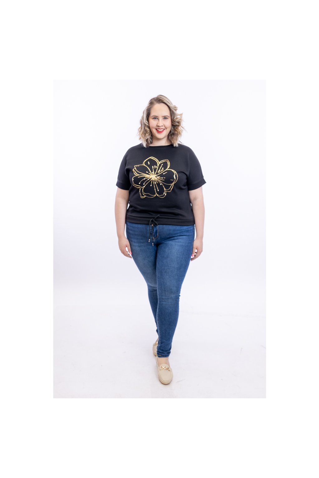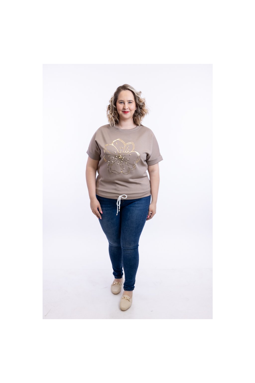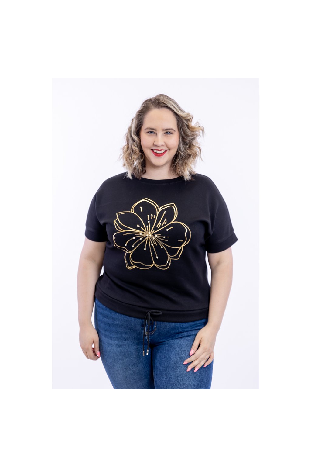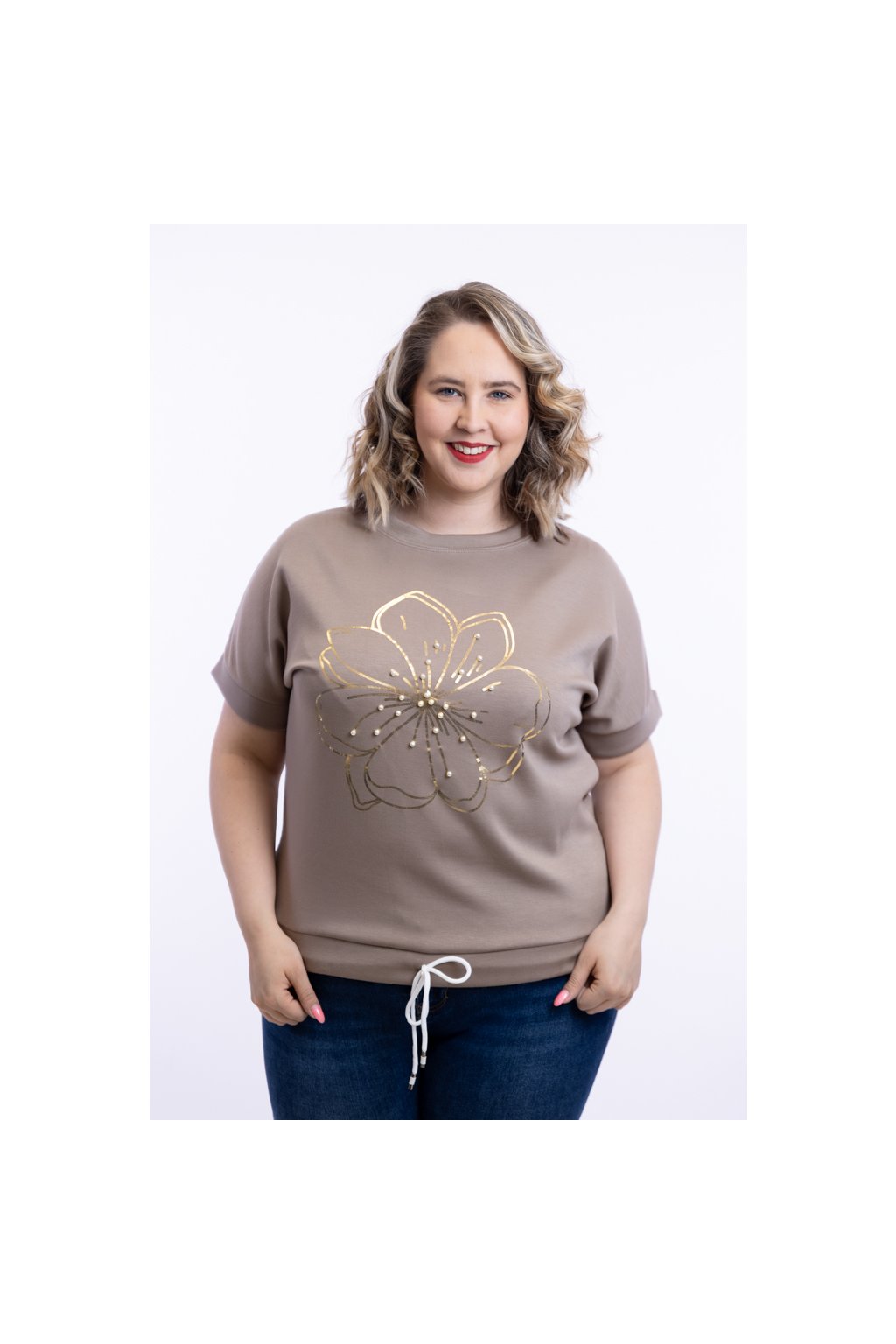 Dámské mikinové tričko MARISOL z luxusního jemného materiálu příjemného na tělo. Třpytivý zlatý vzor ve tvaru květiny s perlovou aplikací působí elegantně a neokoukaně. Spodní lem trička má vpředu stahování šňůrkou, zadní část je zakulacená a prodloužená. Nejlépe sednou velikostem L až 2XL a vybírat můžeš ze 4 barev.
