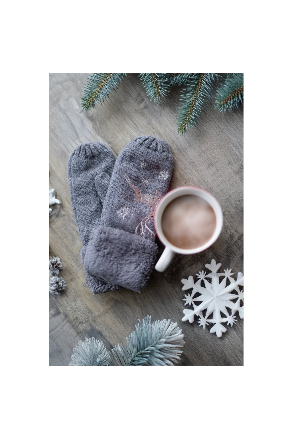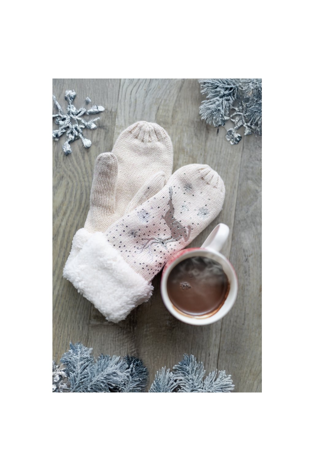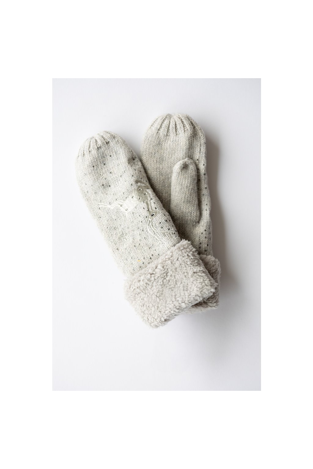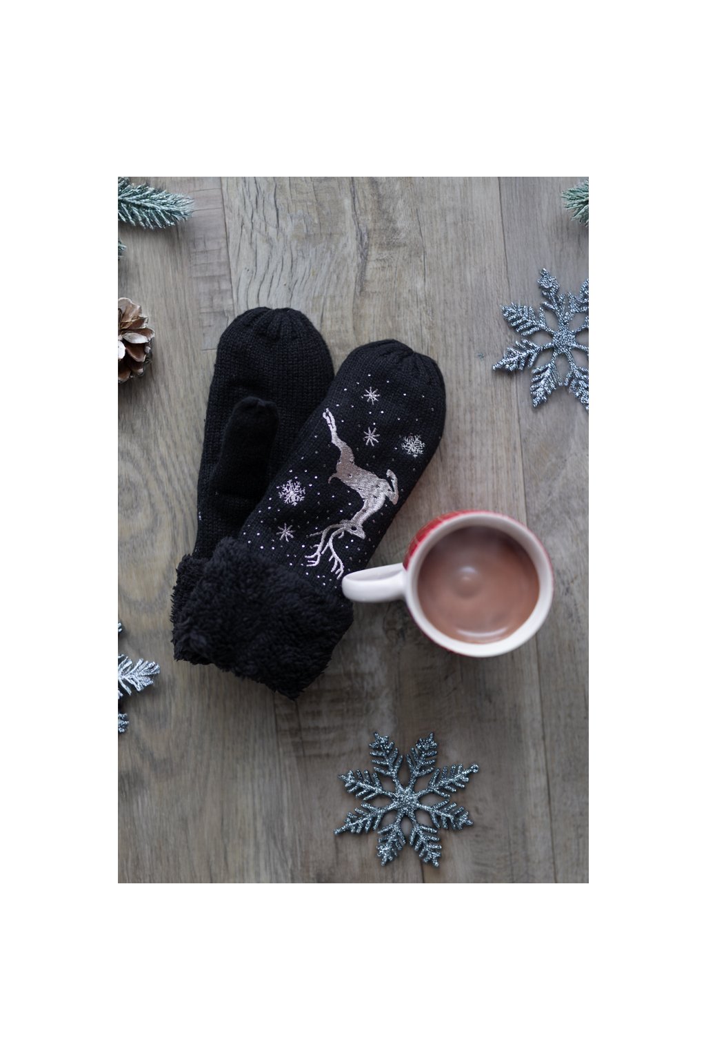Dámské rukavice palčáky SOB mají krásné detaily stříbrně vyšitých sněhových vloček a soba. Rukavice jsou pletené a mají uvnitř chloupek.