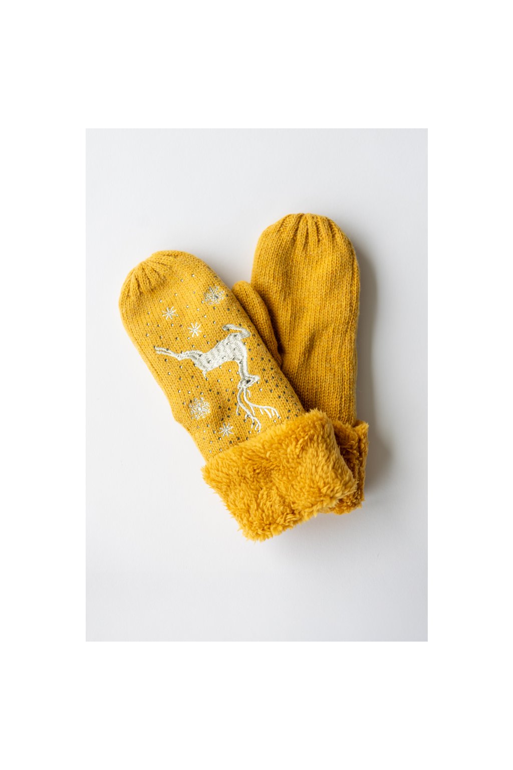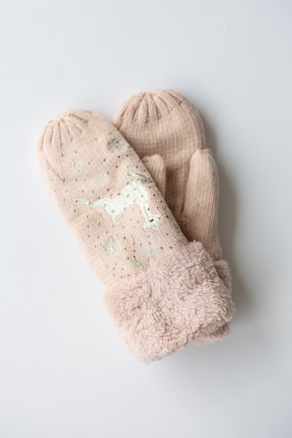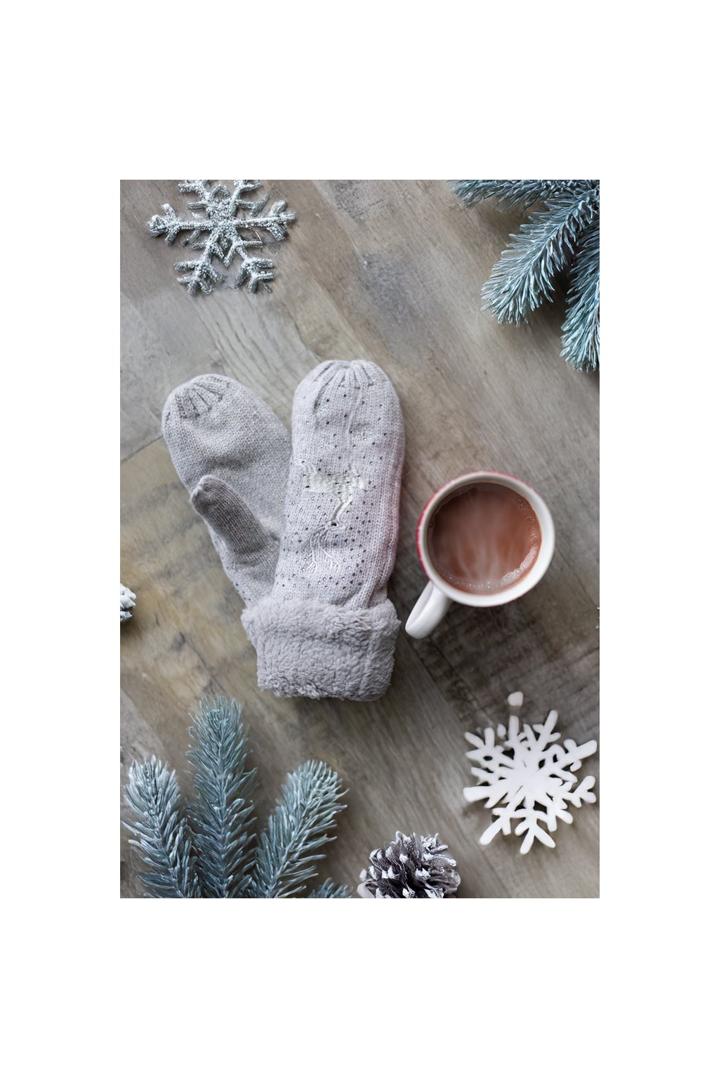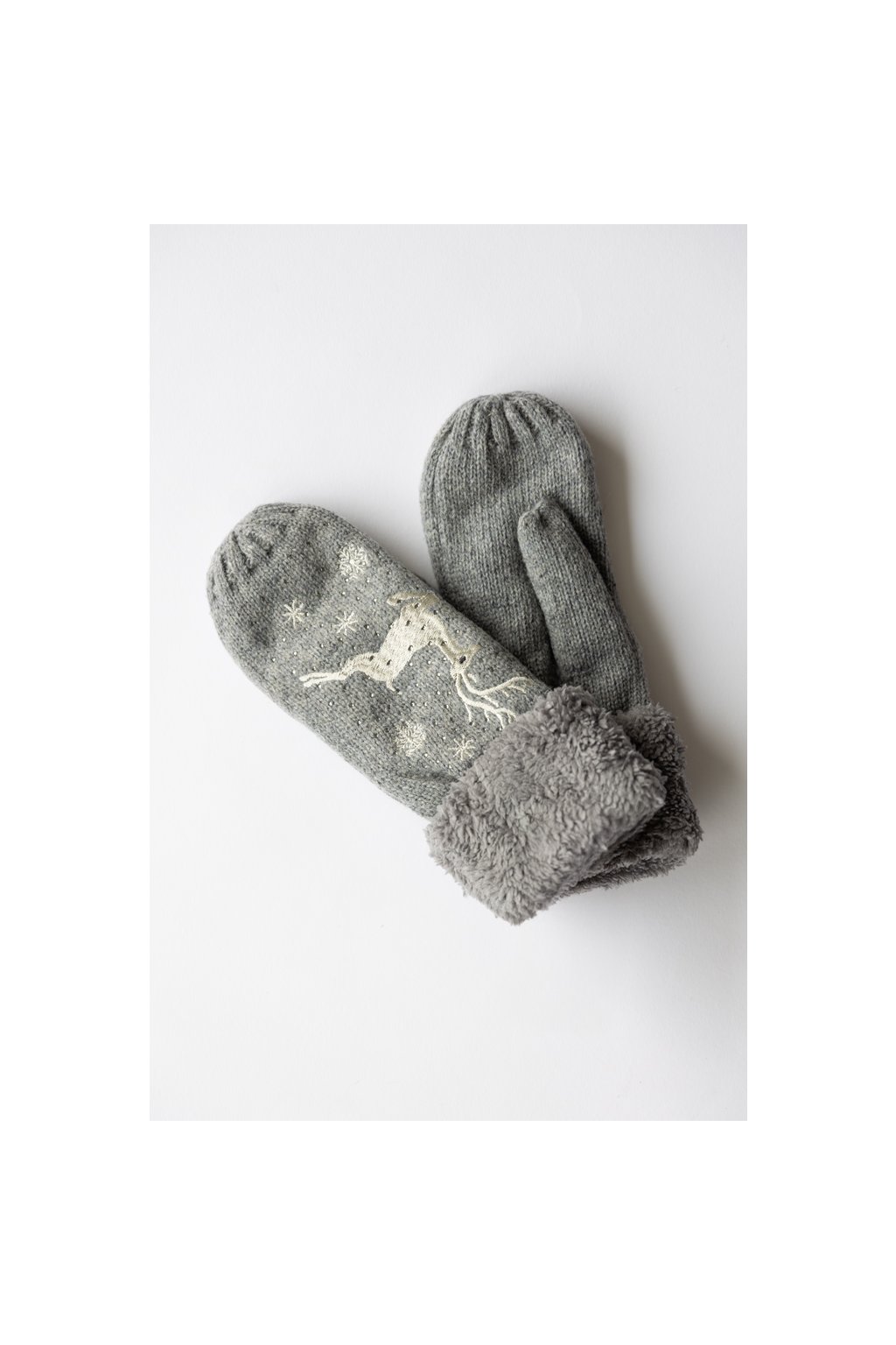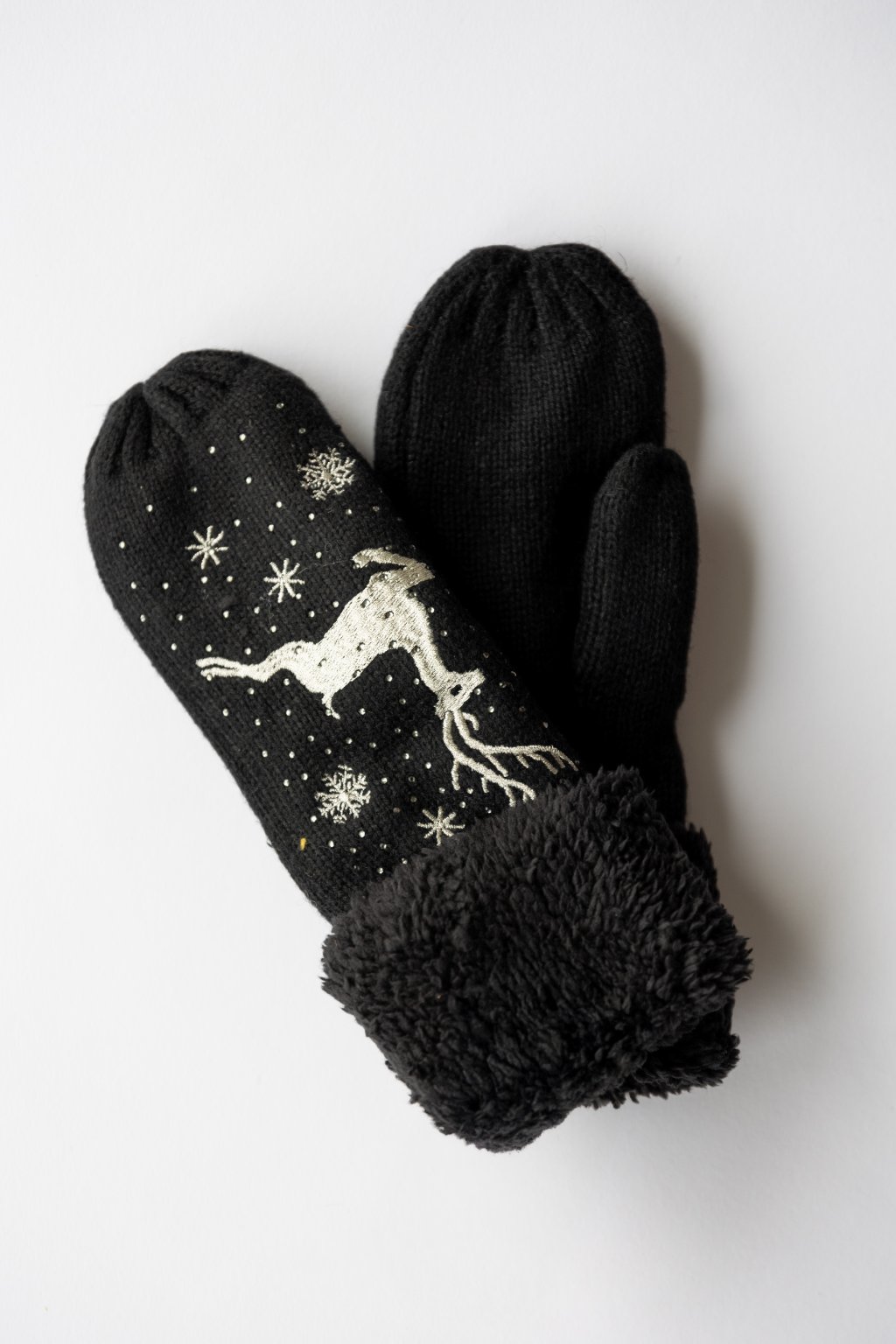 Dámské rukavice palčáky SOB mají krásné detaily stříbrně vyšitých sněhových vloček a soba. Rukavice jsou pletené a mají uvnitř chloupek.