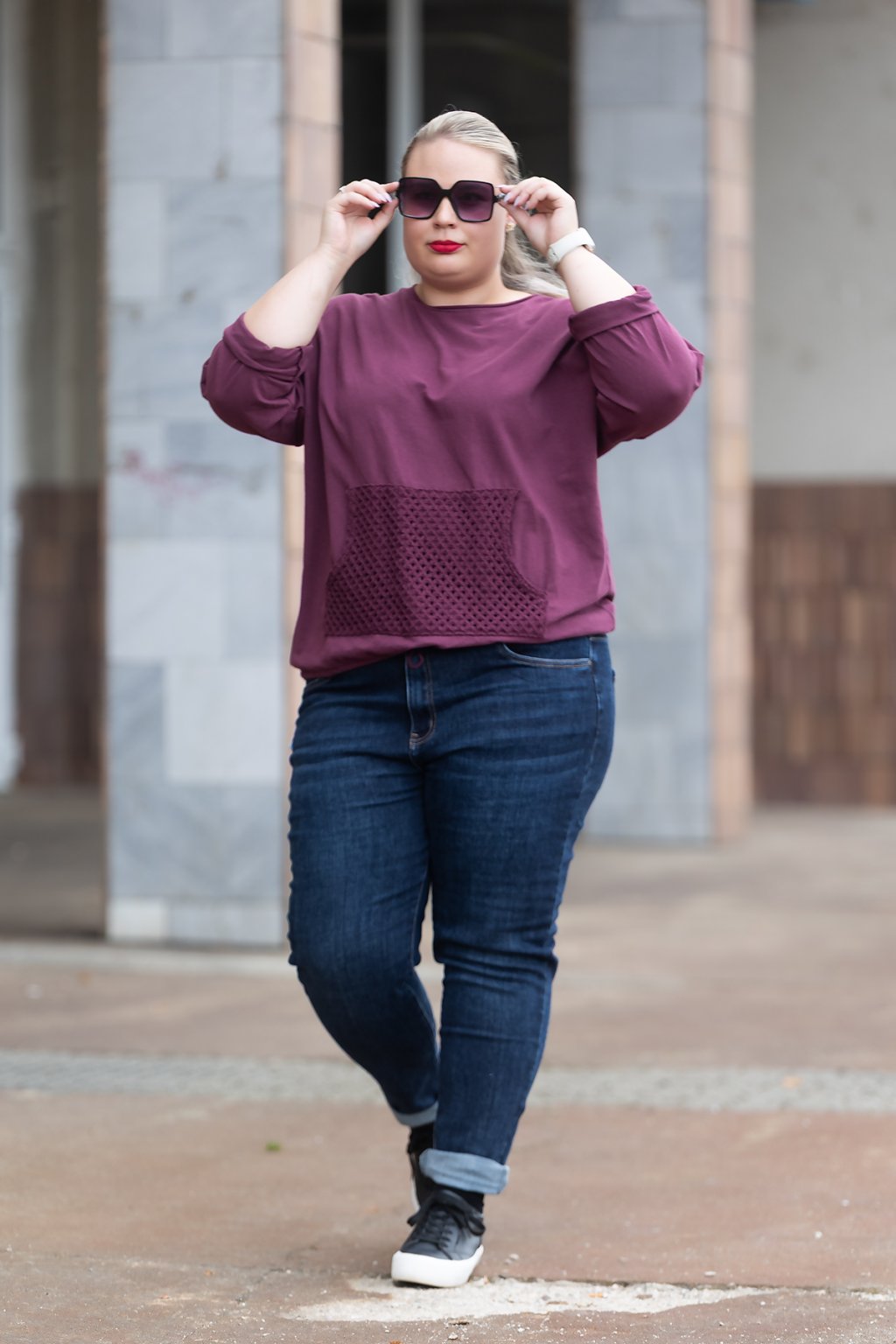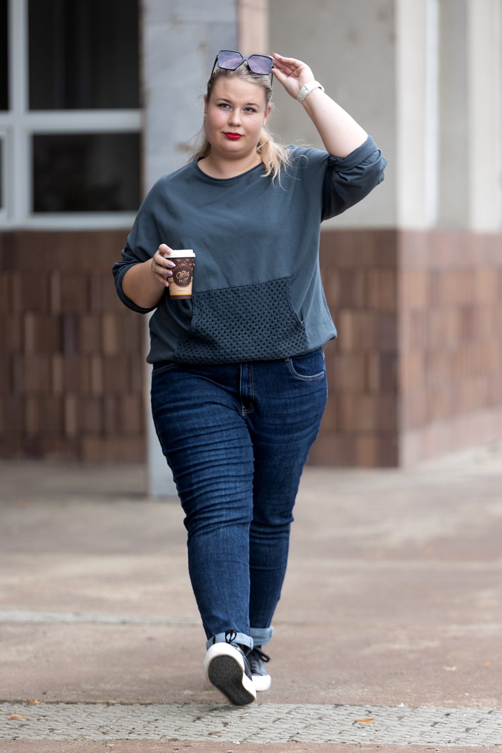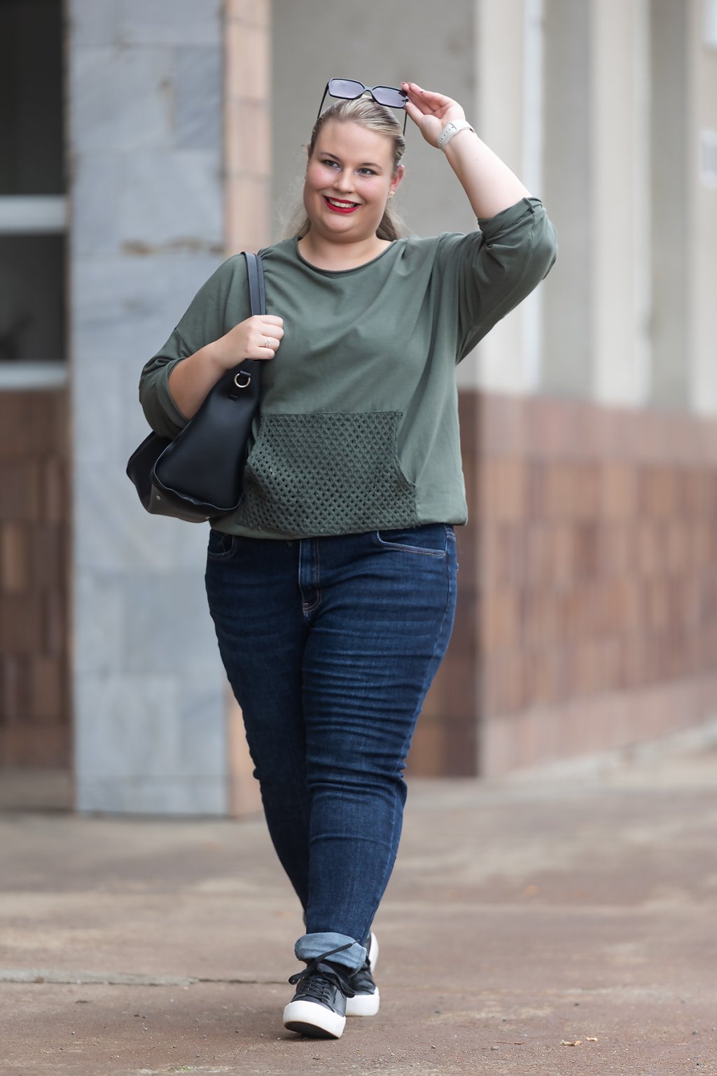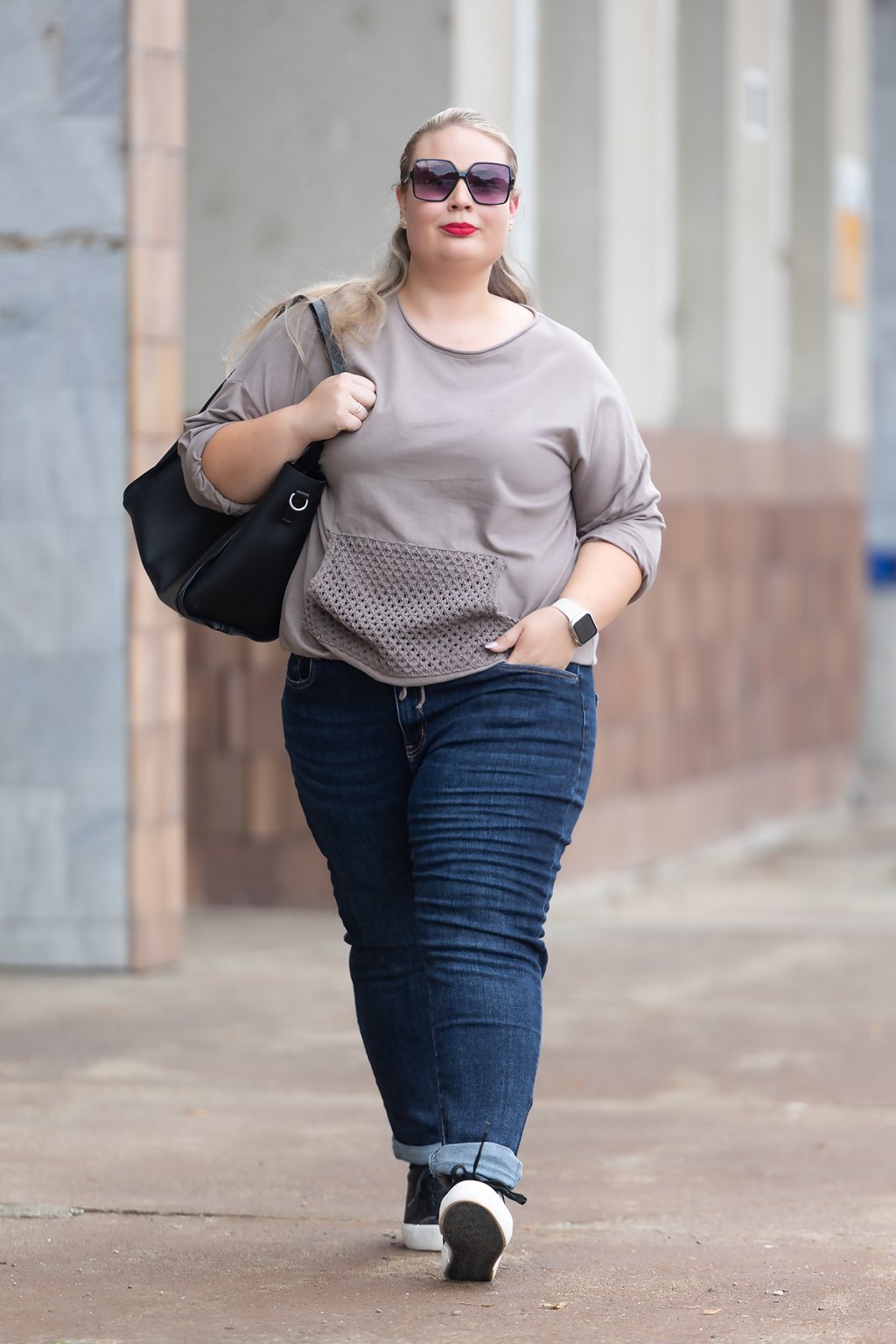 Tento model pro tebe nafotila naše Kristý, běžně nosí velikost XL/2XL a její míry najdeš zde.