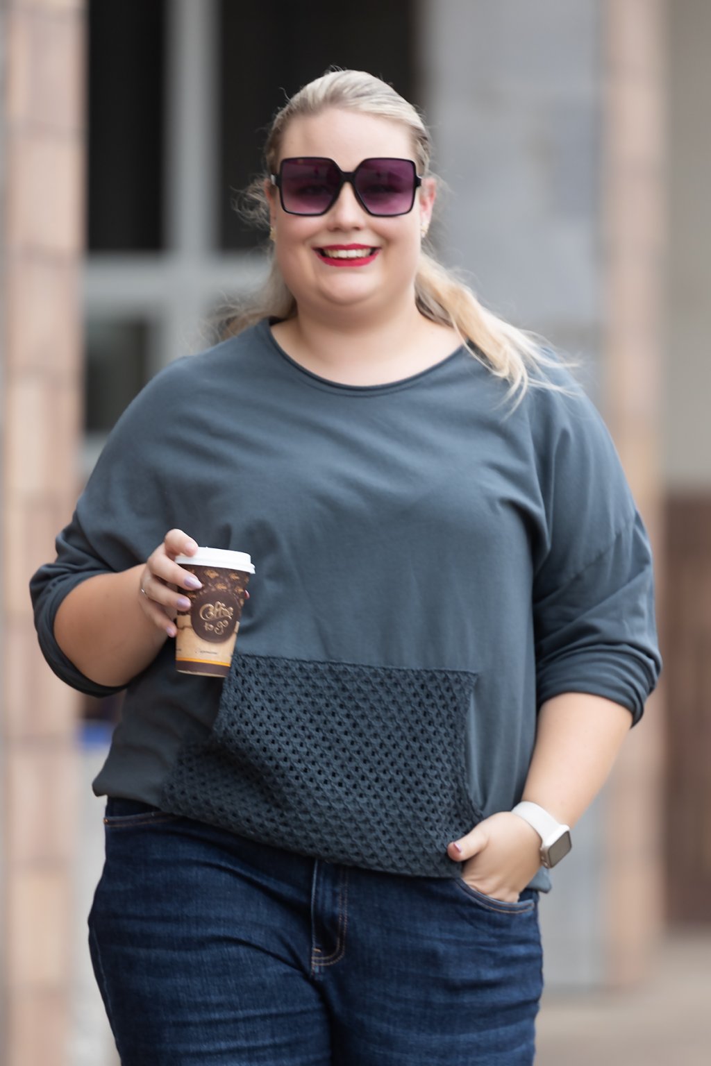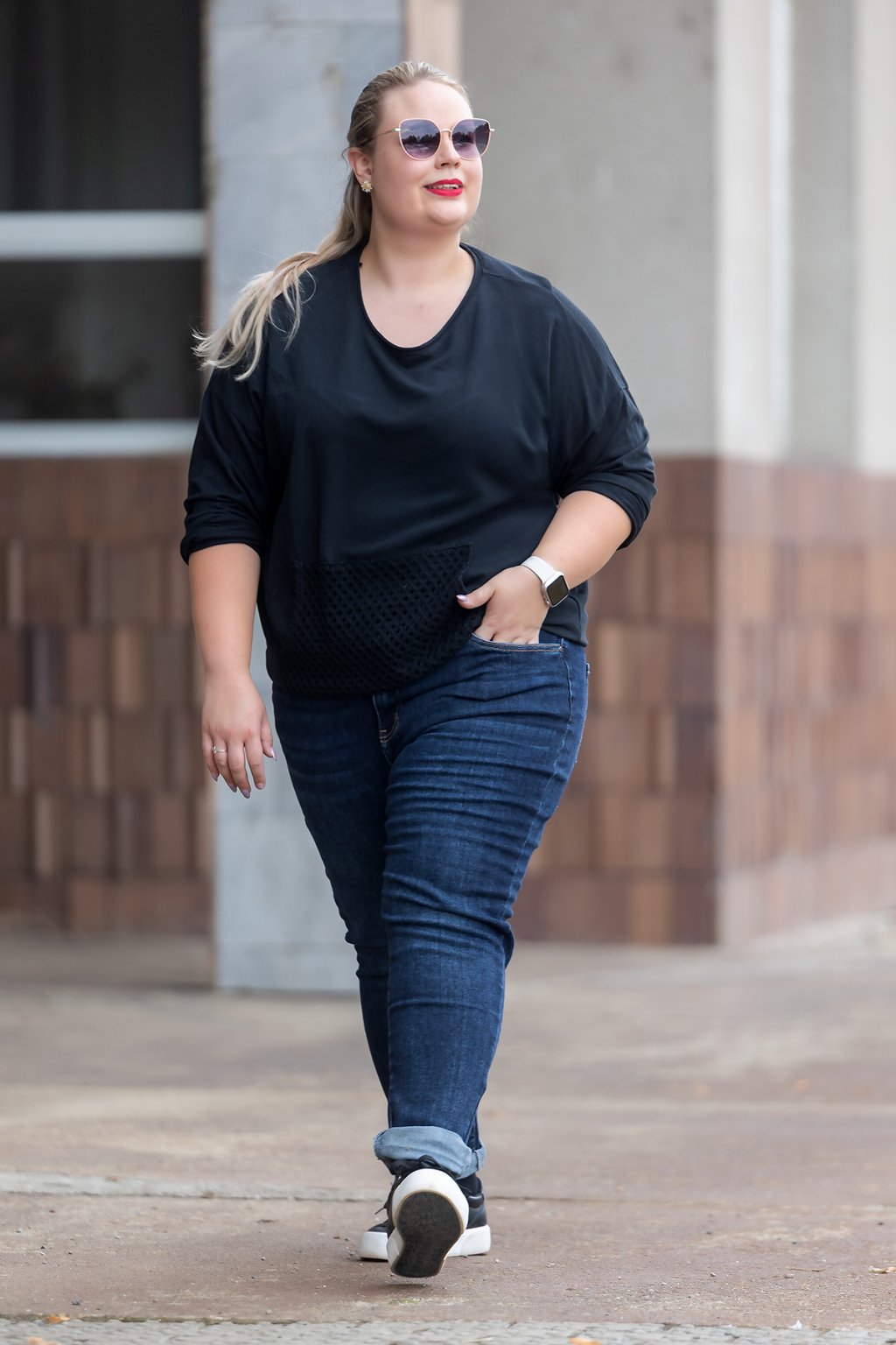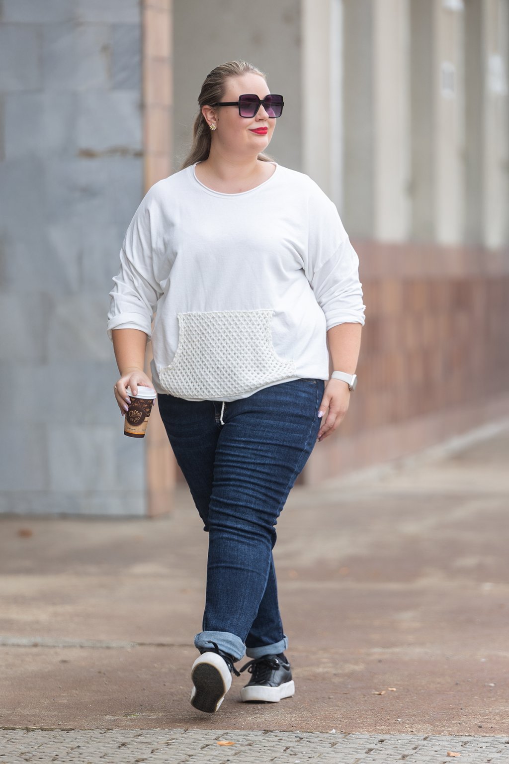 Tento model pro tebe nafotila naše Kristý, běžně nosí velikost XL/2XL a její míry najdeš zde.