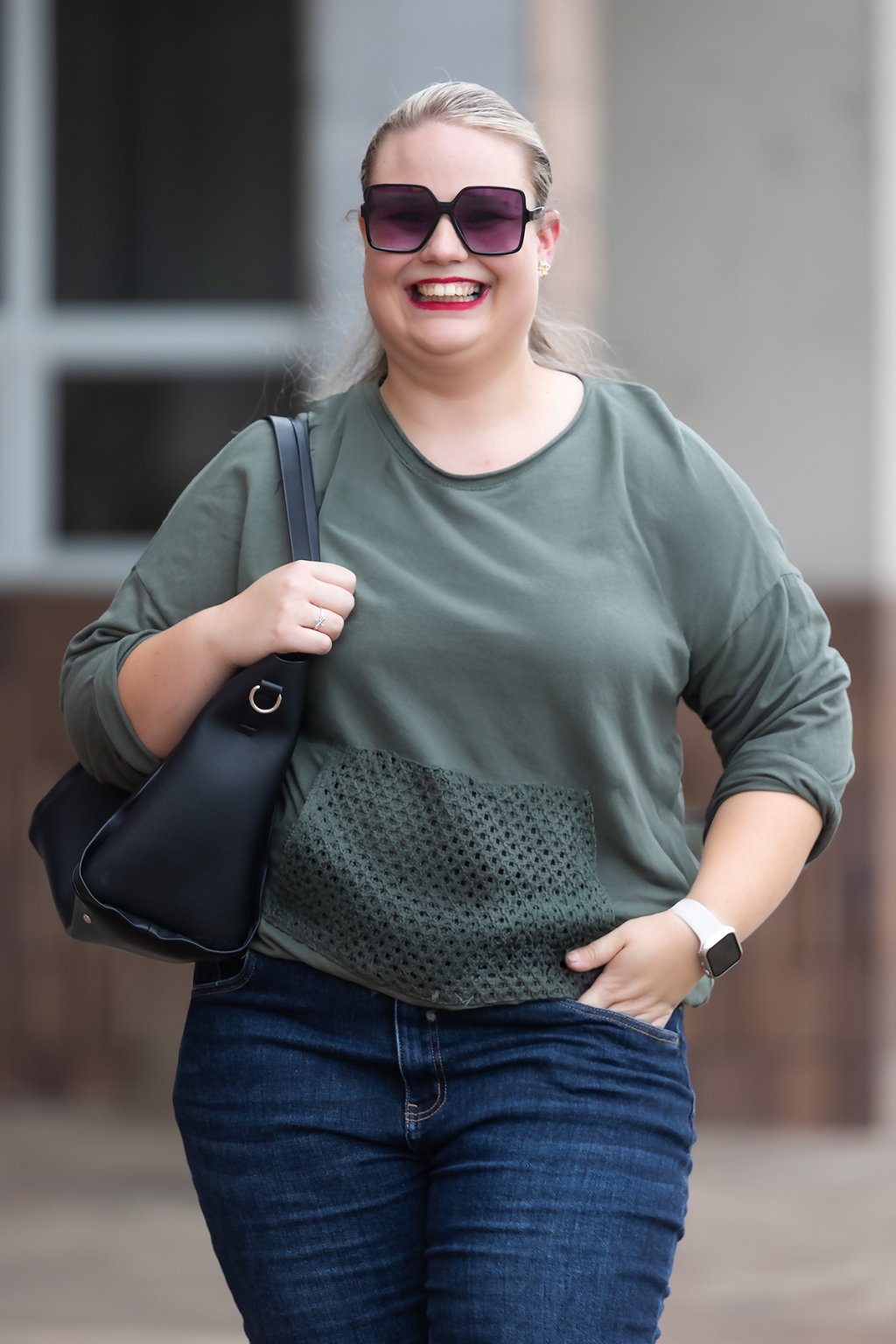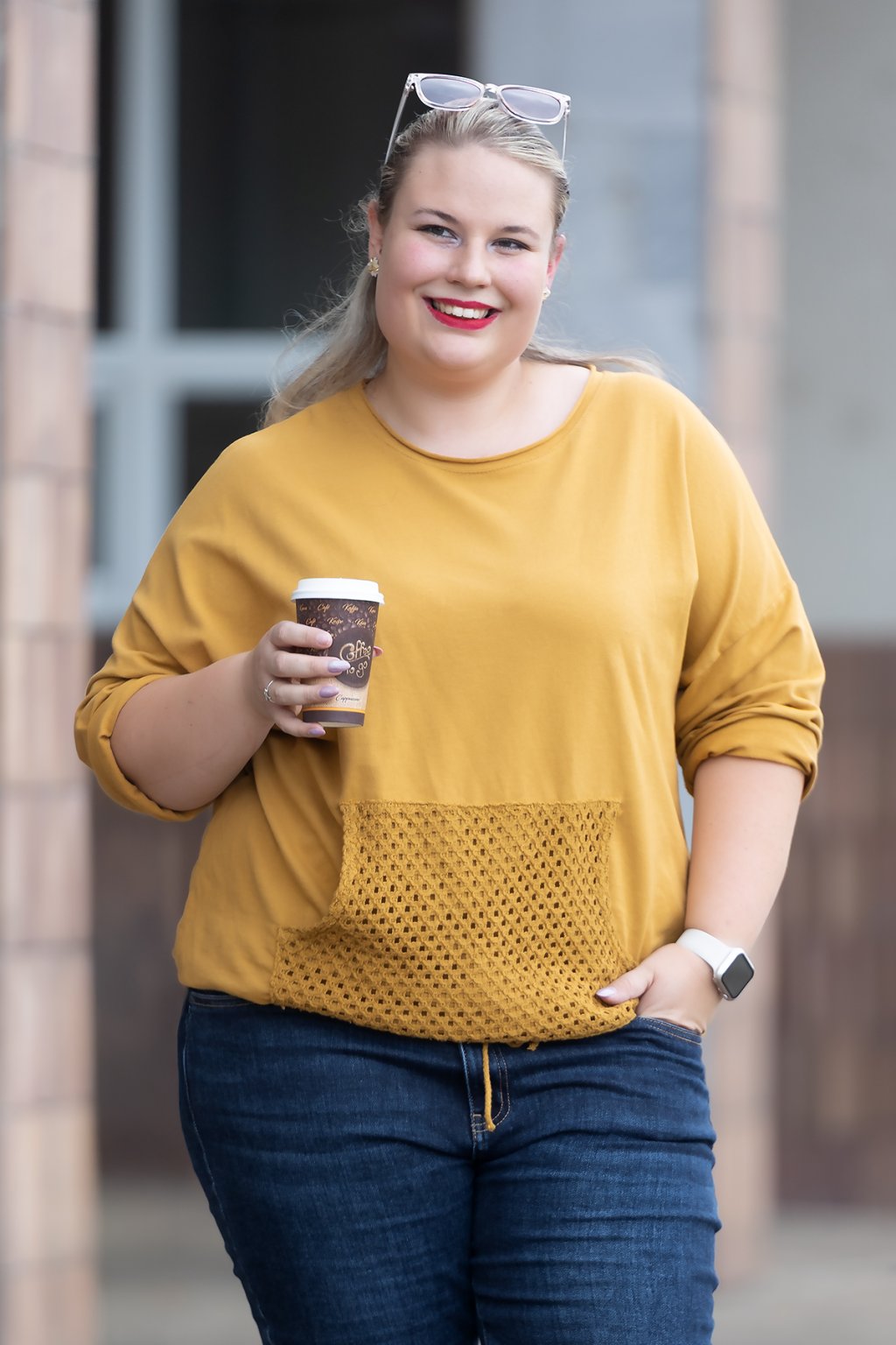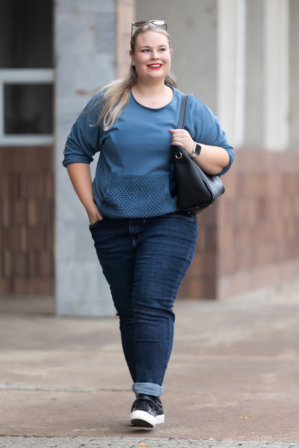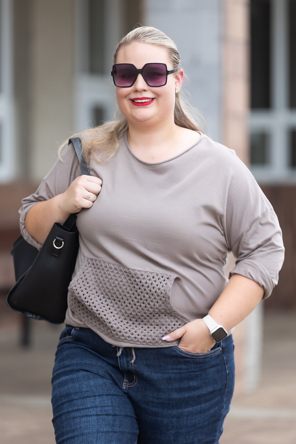 Tento model pro tebe nafotila naše Kristý, běžně nosí velikost XL/2XL a její míry najdeš zde.