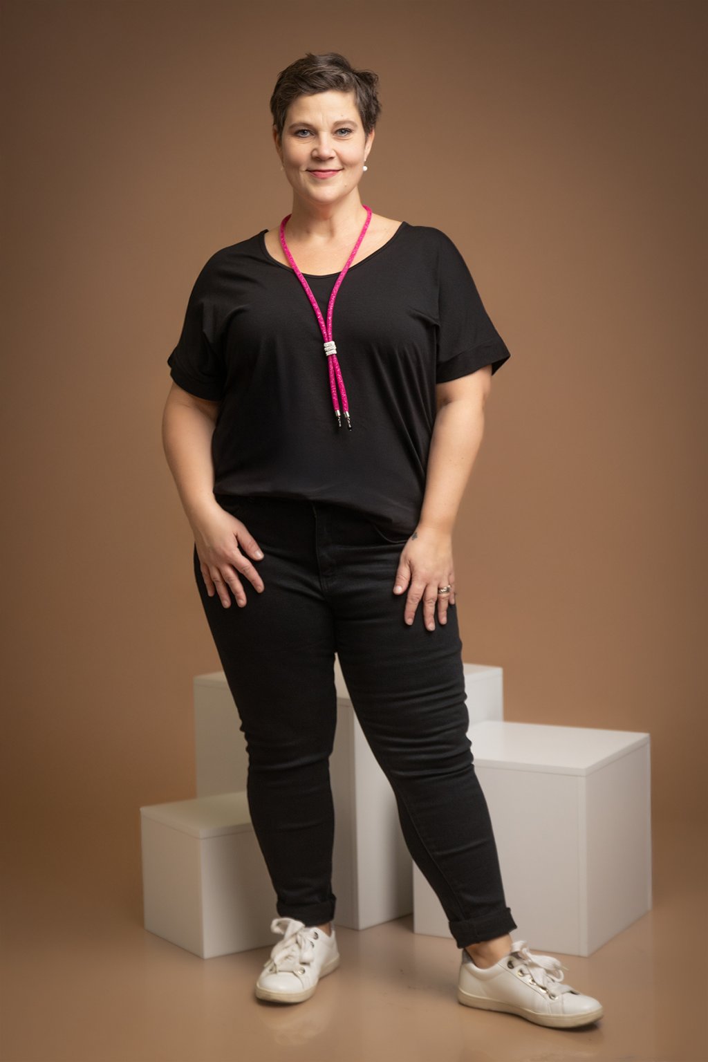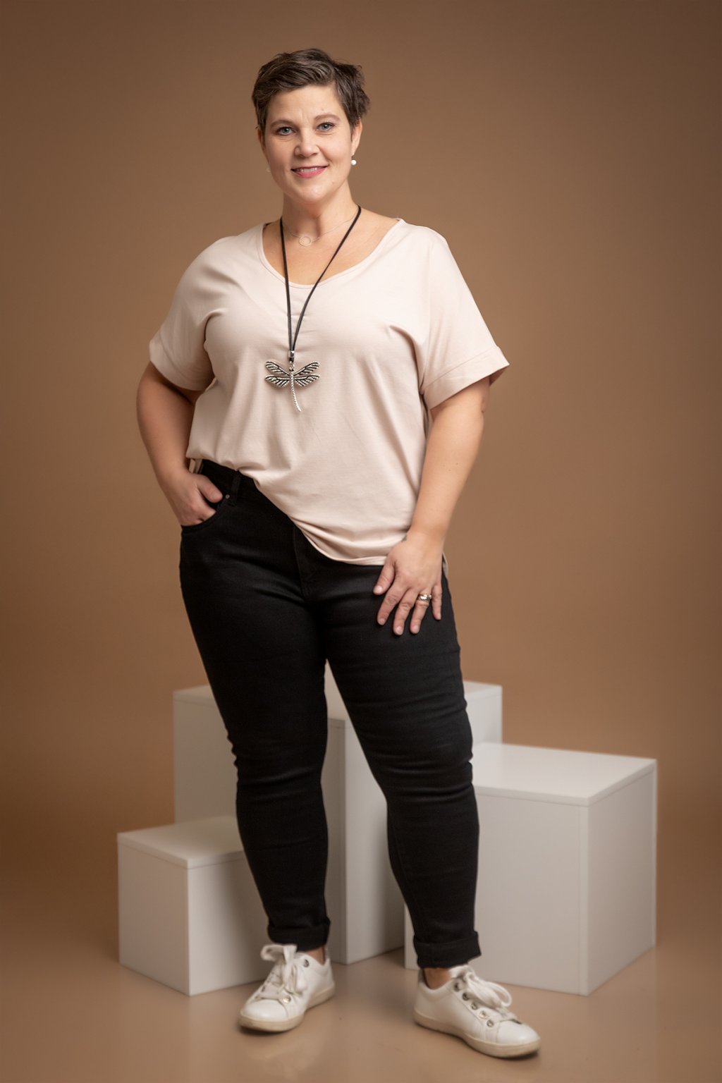 Tento model pro tebe nafotila naše Adél, běžně nosí velikost XL/2XL a její míry najdeš zde.