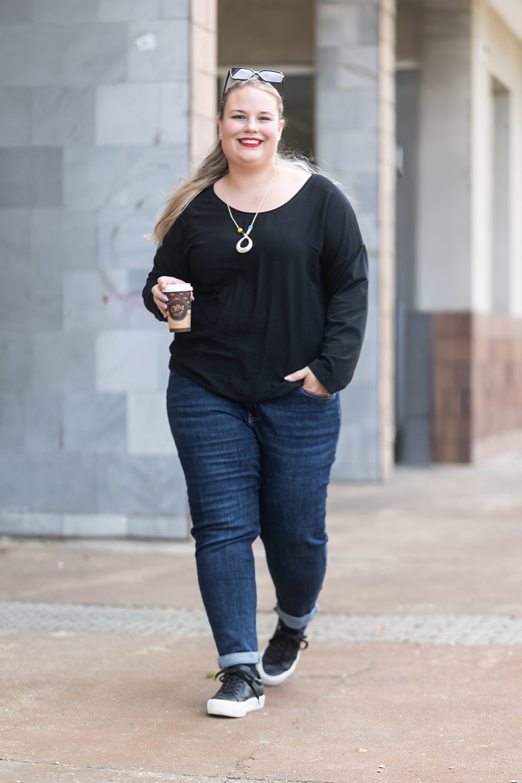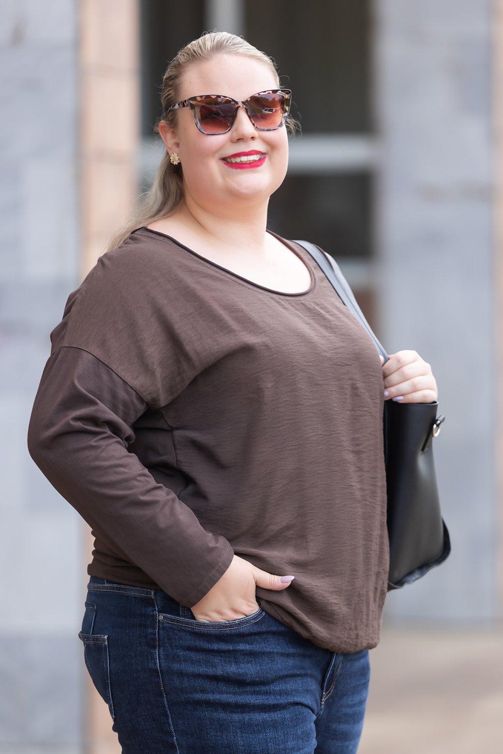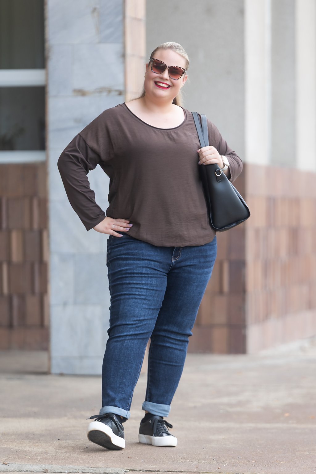 Tento model pro tebe nafotila naše Kristý, běžně nosí velikost XL/2XL a její míry najdeš zde.