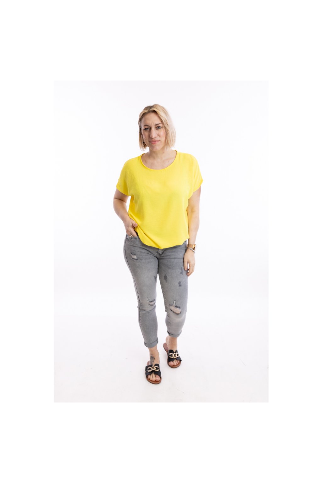Dámské tričko do gumy VIOLETA je univerzální kousek halenkového typu, ze splývavého materiálu, který se snadno kombinuje s dalšími prvky outfitu.