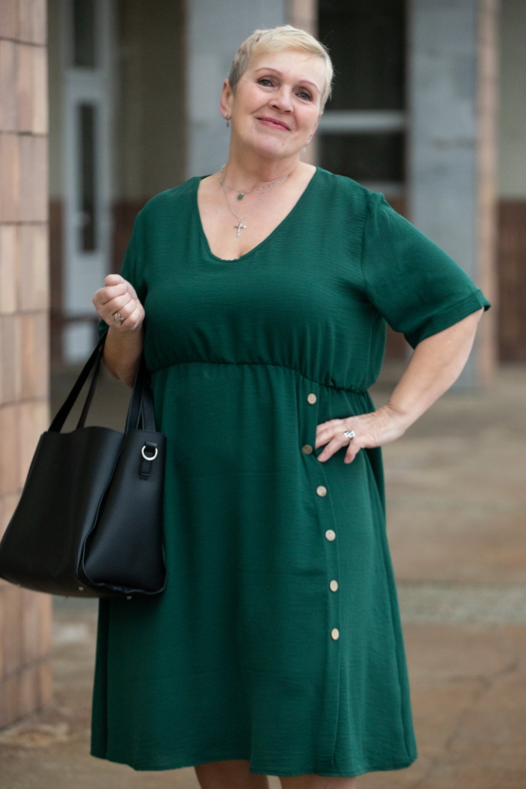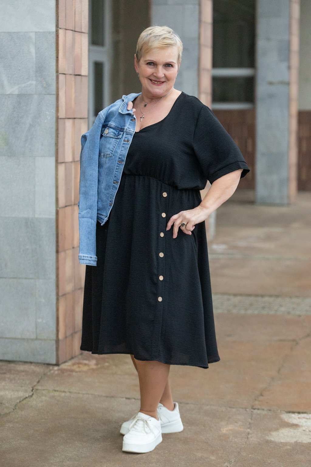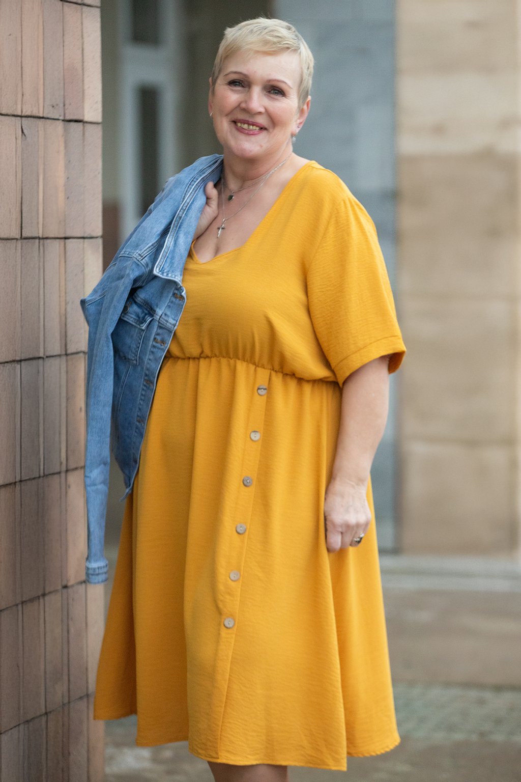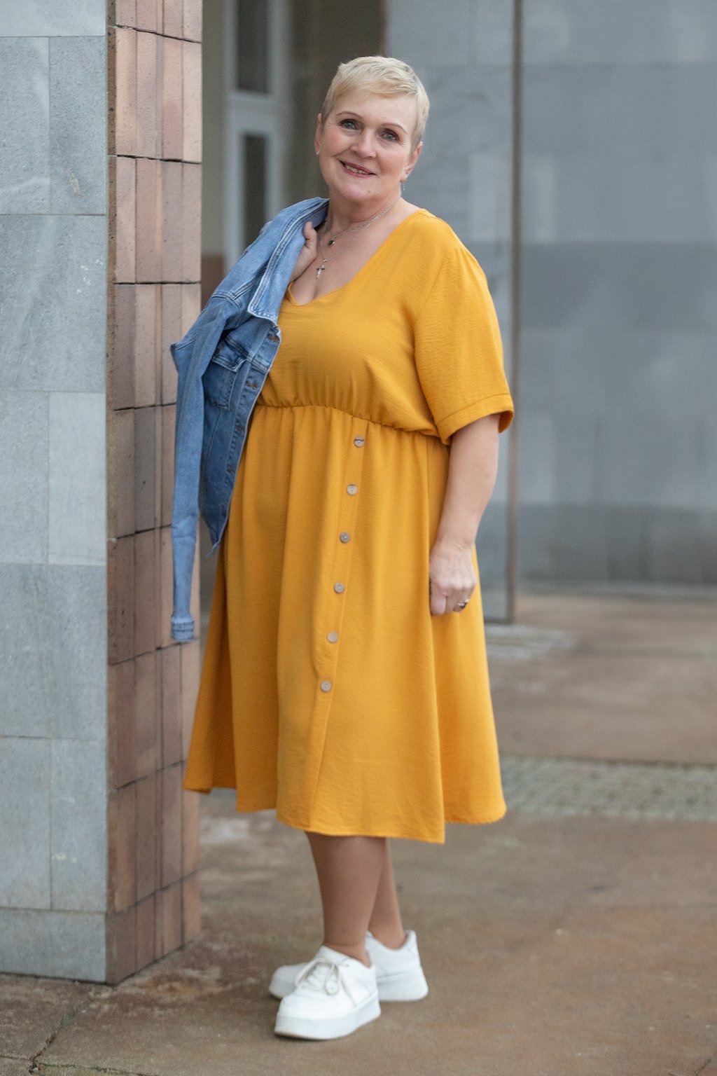 Naše dámské šaty KIMBERLY si zkrátka zamiluješ. Jsou z lehkého a vzdušného materiálu, který je velice příjemný na těle. Potěší tě svým volným střihem, který schová veškeré nedokonalosti. Pod prsy mají šaty pružnou gumu, která krásně zvýrazní tvé přednosti a vytváří nádhernou siluetu. Sukně šatů splývá a navíc je zdobena dřevěnými knoflíky, které z ní dělají jedinečný kousek. Tyto vzdušné šaty mají krátký rukáv a délku k lýtkám. V naší nabídce hrají veselé barvičky, které ti nejlépe sednou pokud nosíš velikost 2XL-4XL.