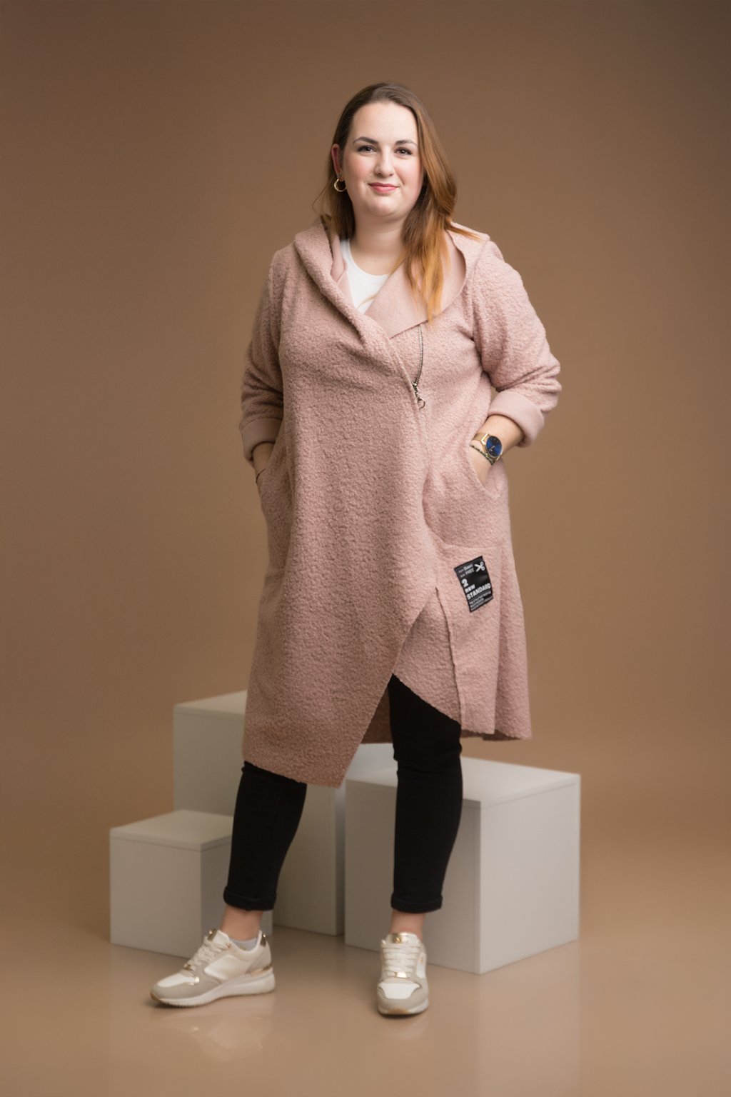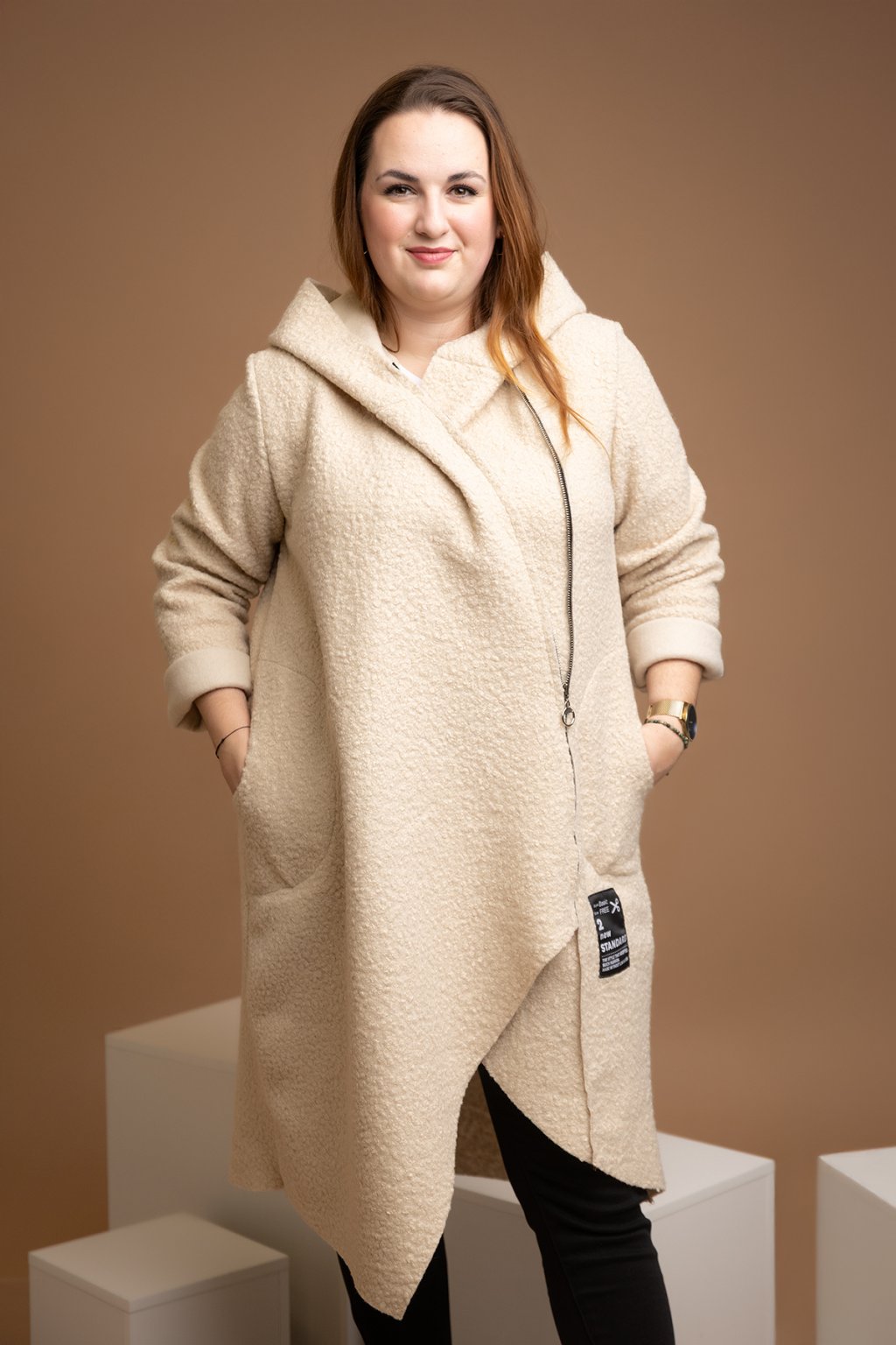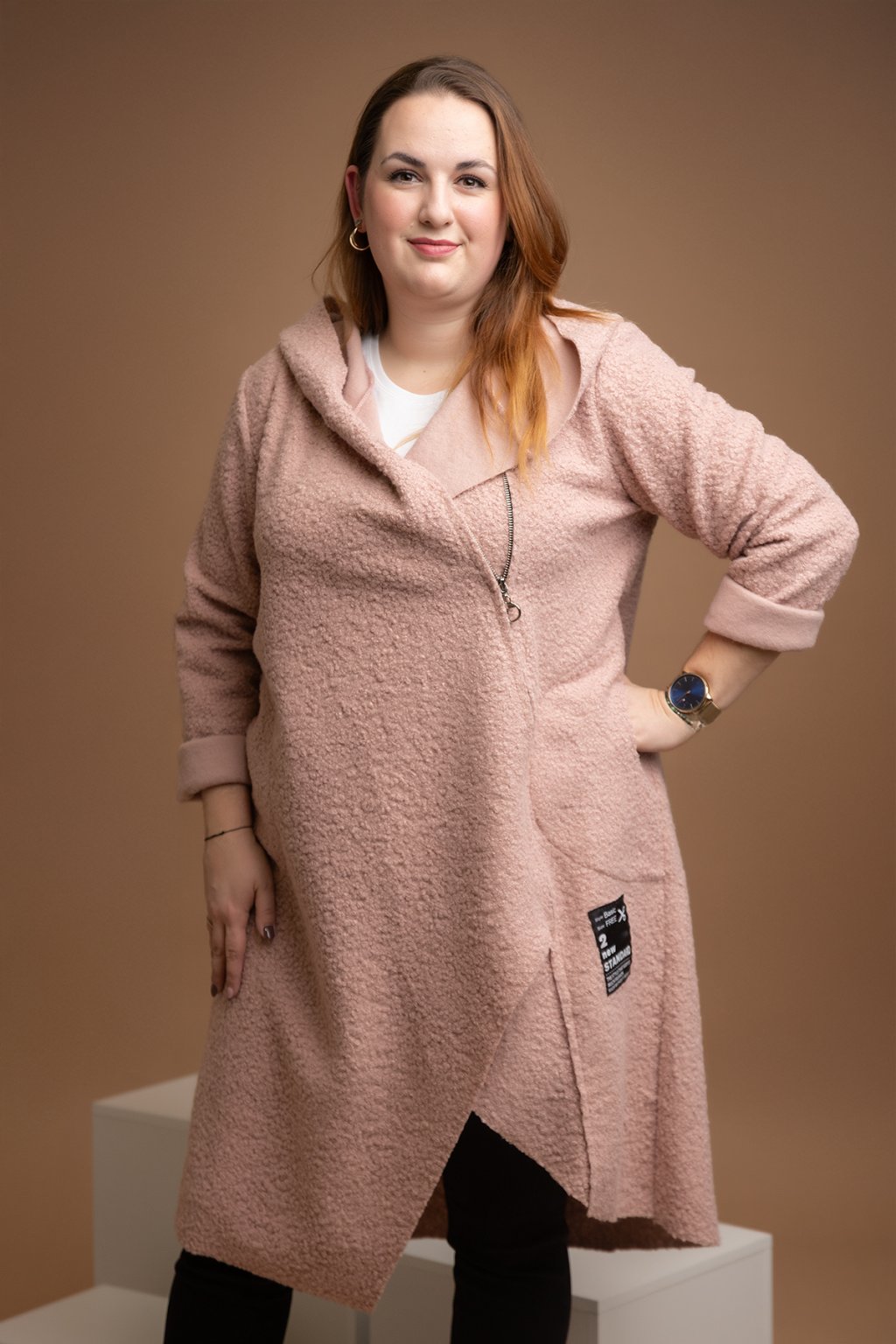 Dámský lehký kabát GRETA se pyšní úžasně pohodlným a originálním materiálem, který na pohled nápadně připomíná jemnou ovčí vlnu. Zip je umístěný na straně a lehce šikmo, což kousku jen přidává šmrnc. Spodní díl je krásně vykrojený a po bocích můžeme najít kapsičky střižené do kulata. Kabátek má u krku samozřejmě kapuci, která tě ochrání před nepřízní počasí. Greta je ideální přechodový kousek, když se mírně ochladí. Kabát nejlépe sedne ženám s postavou XL-3XL. Můžeš si u nás vybrat z několika skvělých barev tu svou oblíbenou.