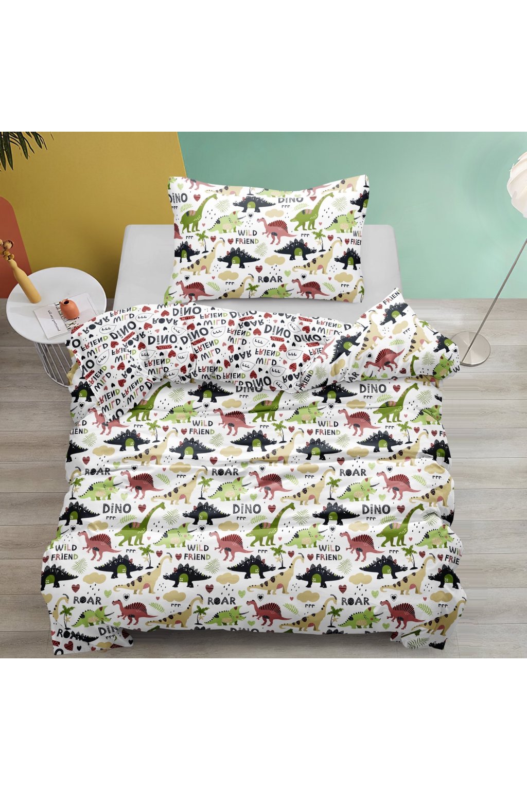 Sada povlečení DINO pro naše nejmenší je po celé délce vzorovaná s motivem dinosaurů a stylových barevných nápisů. Sada obsahuje povlak na polštář a povlečení na peřinu. V tomto skvělém a příjemném povlečení už vás nečeká žádná bezesná noc.