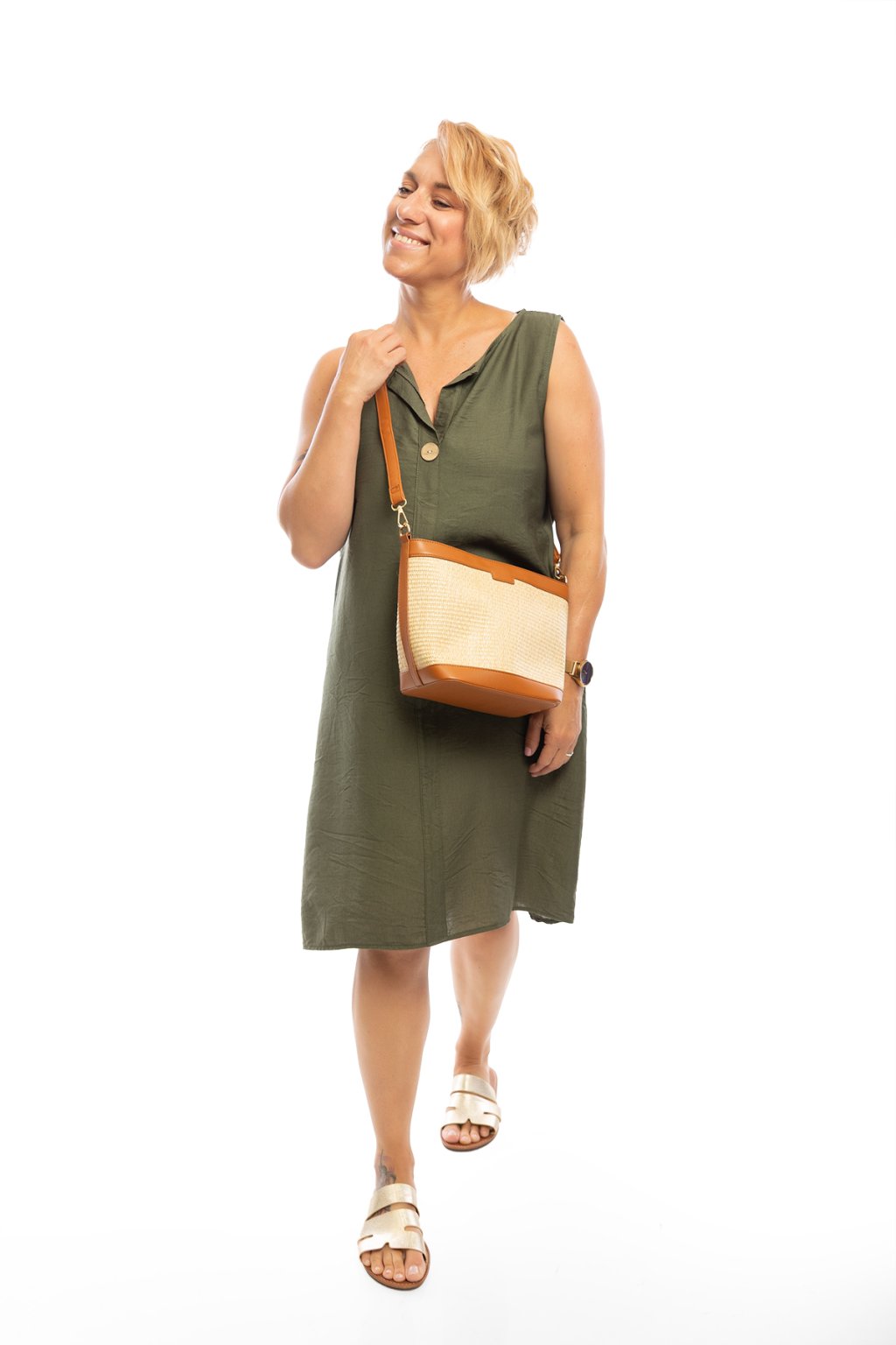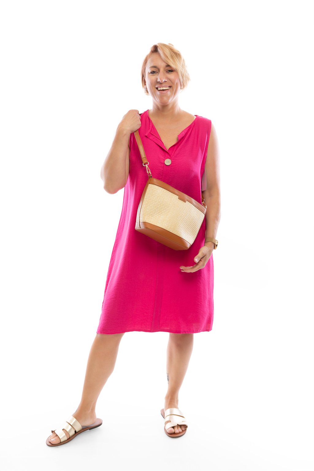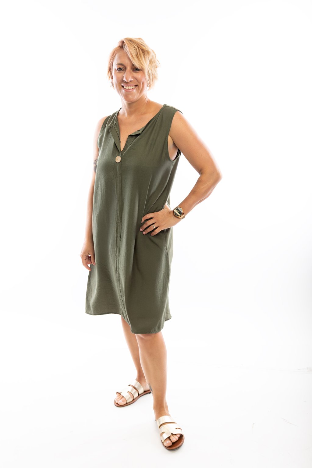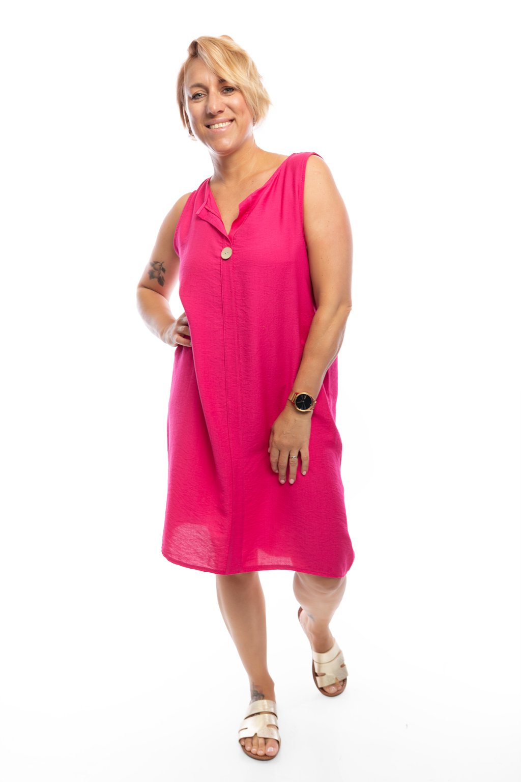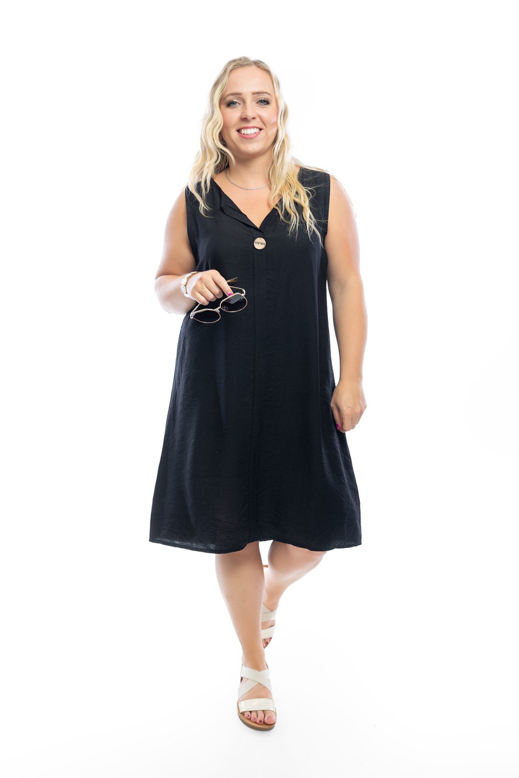 Letní šaty DENY jsou jednoduché a přes to krásné. Šaty jsou bez rukávů a mají výstřih do písmene V, který je zdobený knoflíkem. Uprostřed jsou šaty lemovány podélně pruhem látky. Šaty jsou jednobarevné a nejlépe sednou na postavu s velikostí M-XL. Na výběr máš z mnoha barev.