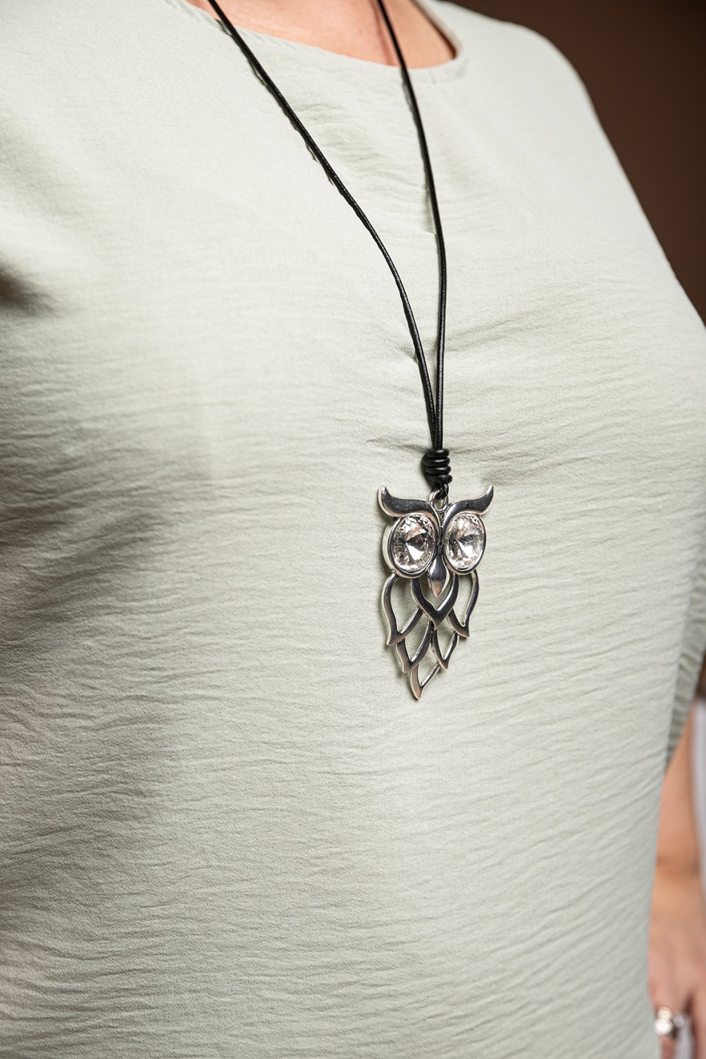 Dámská náhrdelník SOVA - stylový a elegantní kousek, který vykouzlí z každého tvého outfitu jedinečnou podívanou. Doladí každý tvůj kousek k naprosté dokonalosti. Přívěšek je z oceli, doplněn třpytivými kamínky a je pověšený na syntetické kůži.