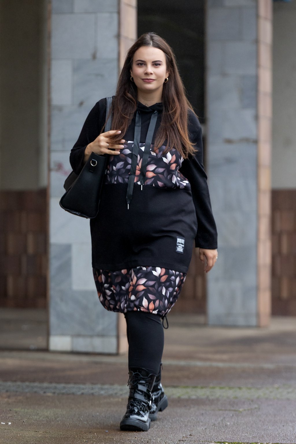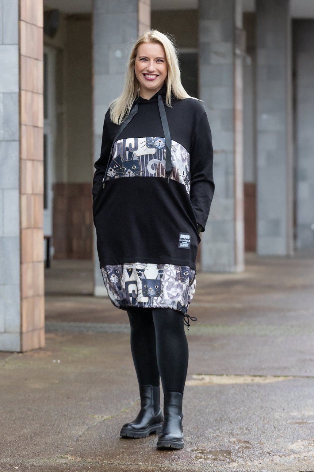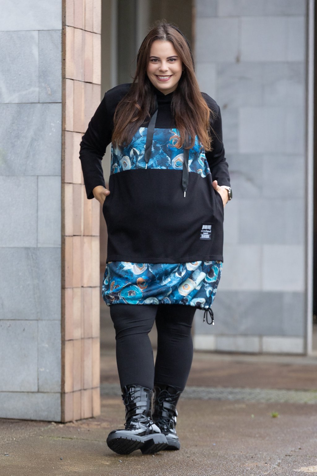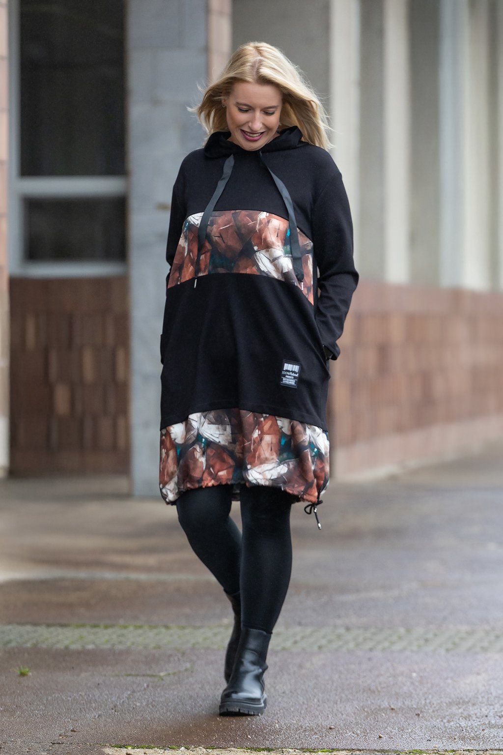 Šaty FLAME jsou ideální volbou na přechodová období a to hlavně díky silnějšímu a hřejivému materiálu, který v chladnějších dnech určitě uvítáš. Jak sis už určitě všimla, jsou vybavené kapucí, která je doplněná tkaničkami, díky kterým se dá upravit dle potřeb. Šaty mají dlouhé rukávy a volnější, rovný střih. Spodní lem si upravíš podle svých preferencí stahováním na tkaničky. Šaty mají černou barvu a jsou zdobené podélnými pruhy, které na sobě mají barevné motivy a na výběr je z mnoha vzorů. Nejlépe sedí na postavu s velikostí L-3XL a za nás jsou prostě boží!