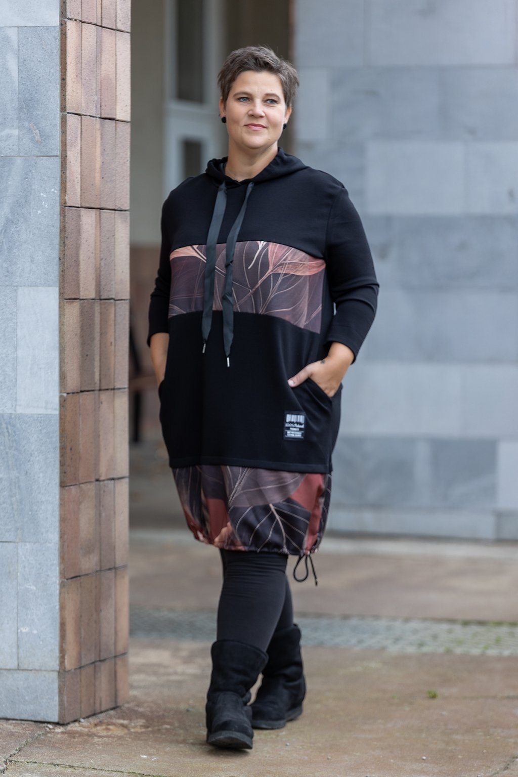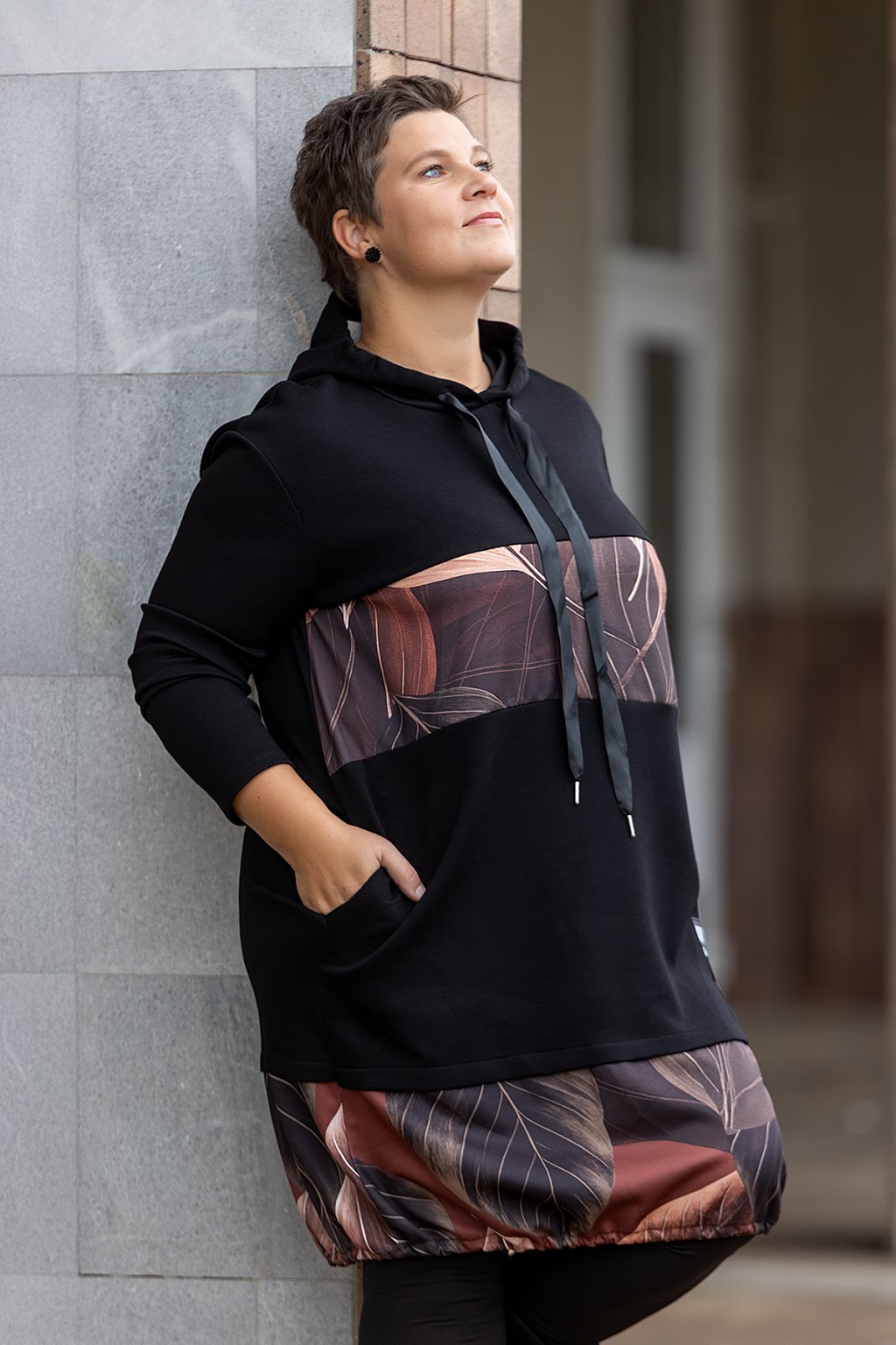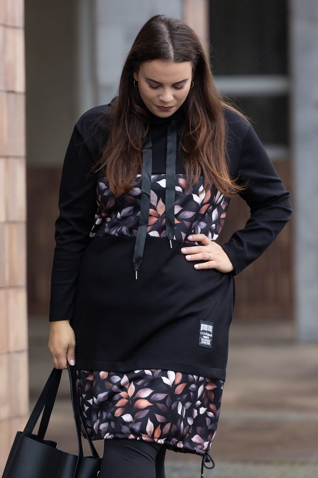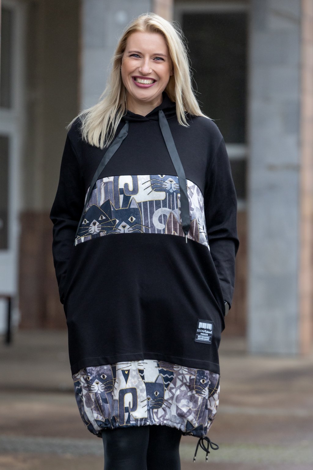Šaty FLAME jsou ideální volbou na přechodová období a to hlavně díky silnějšímu a hřejivému materiálu, který v chladnějších dnech určitě uvítáš. Jak sis už určitě všimla, jsou vybavené kapucí, která je doplněná tkaničkami, díky kterým se dá upravit dle potřeb. Šaty mají dlouhé rukávy a volnější, rovný střih. Spodní lem si upravíš podle svých preferencí stahováním na tkaničky. Šaty mají černou barvu a jsou zdobené podélnými pruhy, které na sobě mají barevné motivy a na výběr je z mnoha vzorů. Nejlépe sedí na postavu s velikostí L-3XL a za nás jsou prostě boží!