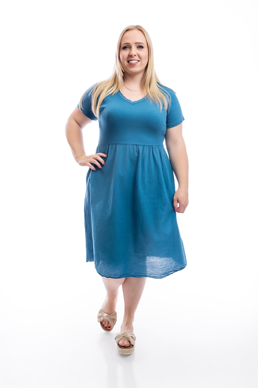 Letní šaty ZELDA tě zaujmou svým neokoukaným střihem. Tyhle šaty mají jedinečný šmrnc - výstřih do "véčka" s lehce roztřepeným okrajem a v oblasti prsou je pružné žebrování. Na bocích mají kapsy. Velikostně nejlépe sednou na M až XL a vybírat můžeš z několika barev.