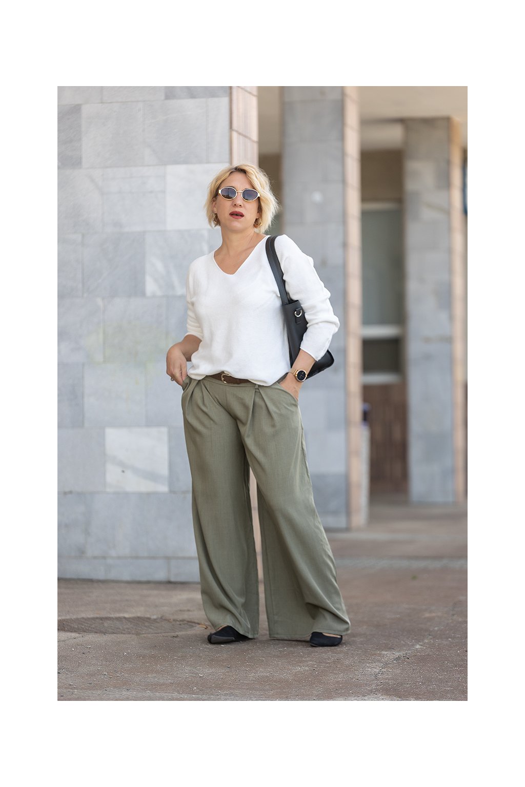 Zajímavé kalhoty na pomezí pohodlí a elegance :-) líbí se mi. Zakoupeny v khaki barvě, mají takový retro šmrnc. Pásek k nim nosit nebudu, není moc použitelný.