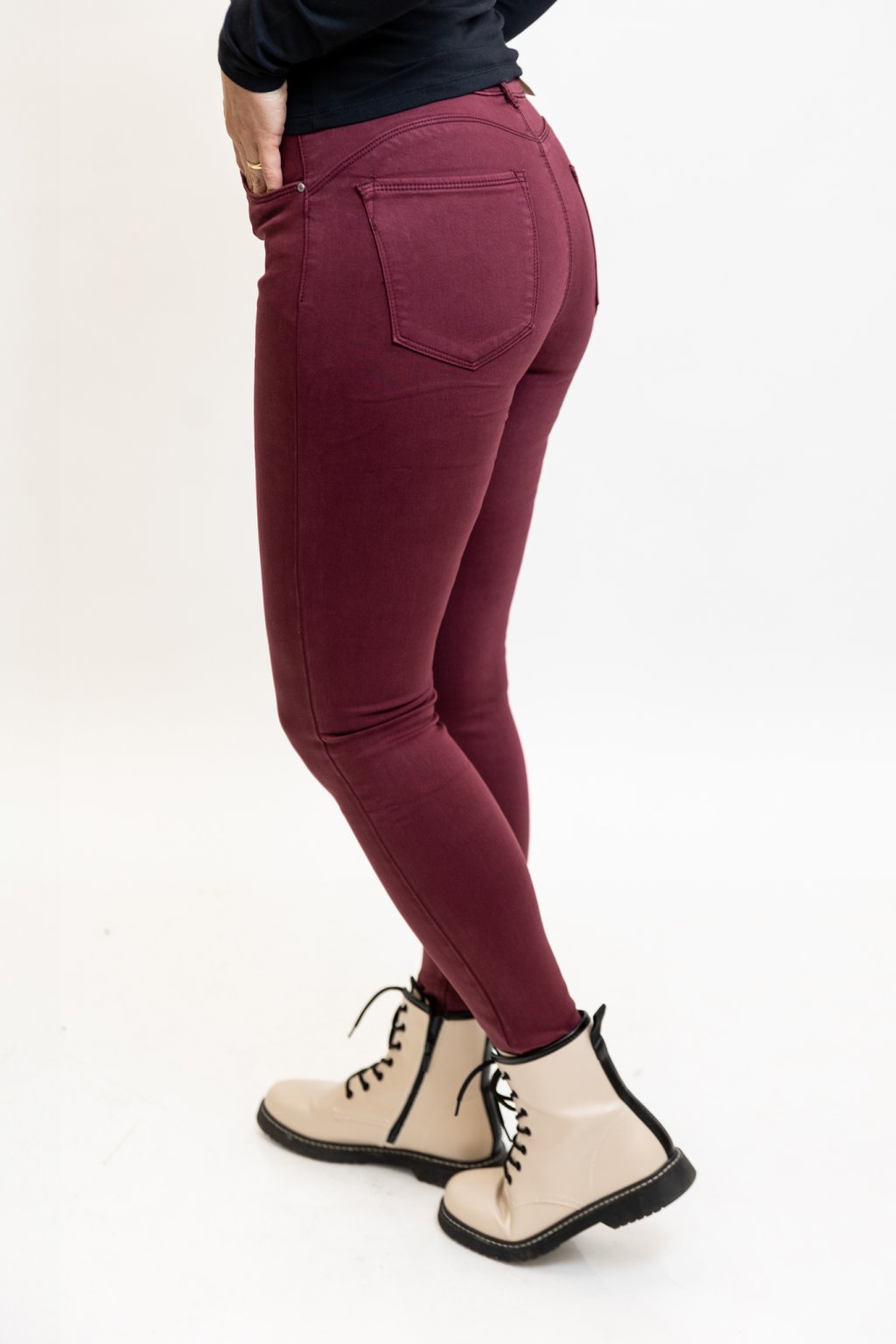Strečové džíny STYLE wine red pruží po celé délce kalhot. Obloučkový střih zadní části vykouzlí hezky zaoblený zadeček.