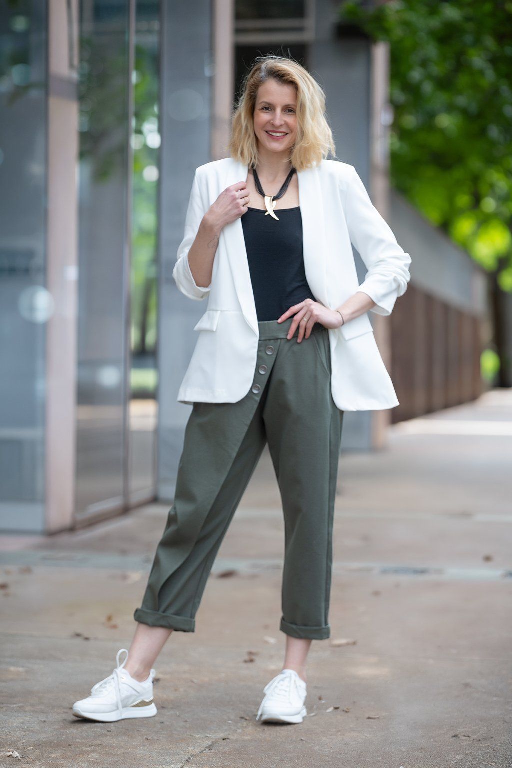 Zakoupila jsem si 2x kalhoty-1x trávově zelené kalhoty Ruby,které naprosto perfektně sedí a jsou ještě k tomu neokoukané!A 1x kalhoty smetanové Merci s páskem,které jsou také moc pohodlné!A petrolejové pružné sako.Vše skvělá volba!